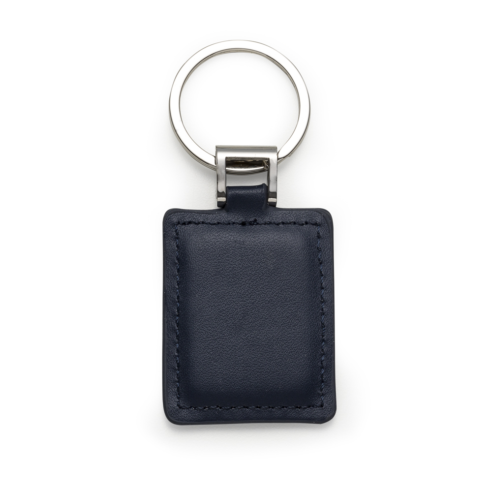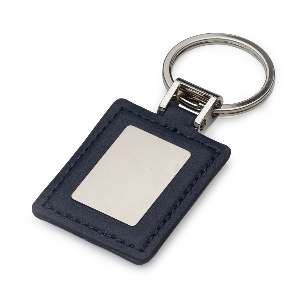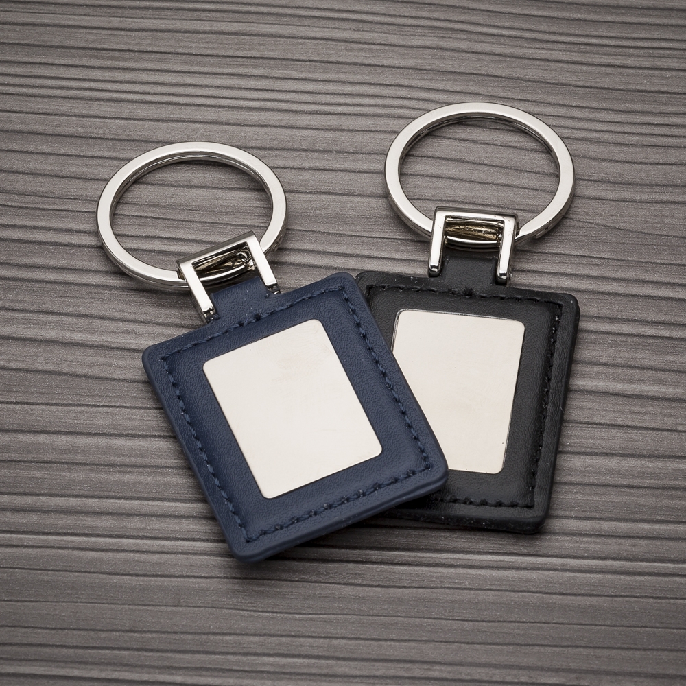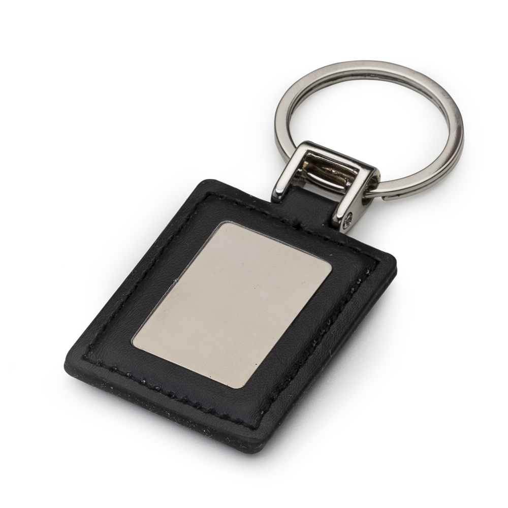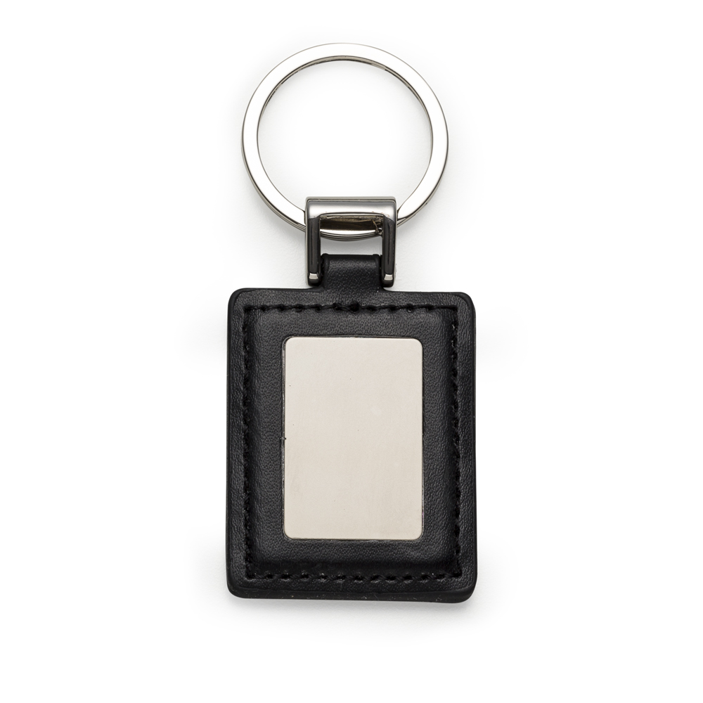 Chaveiro quadrado de material sintetico (imitação de couro)com chapa de metal fosca no centro, verso couro liso.