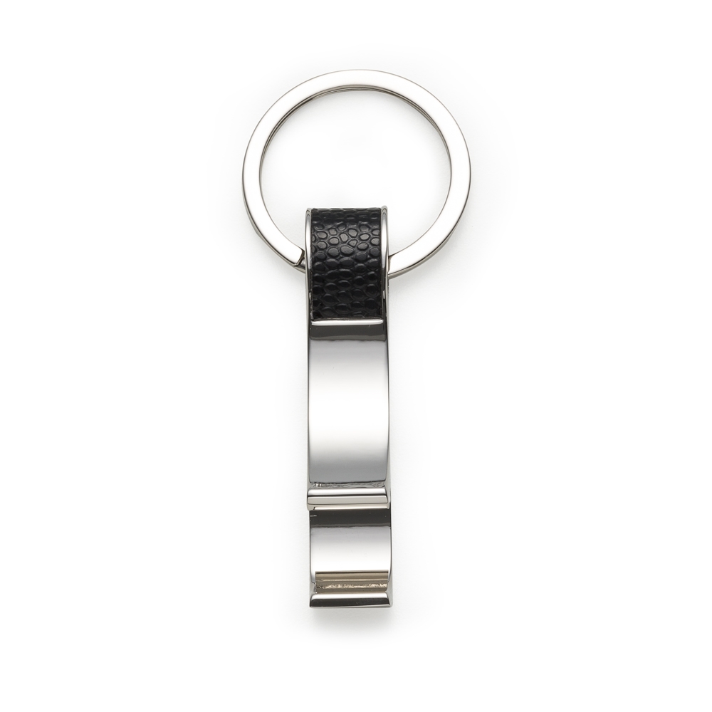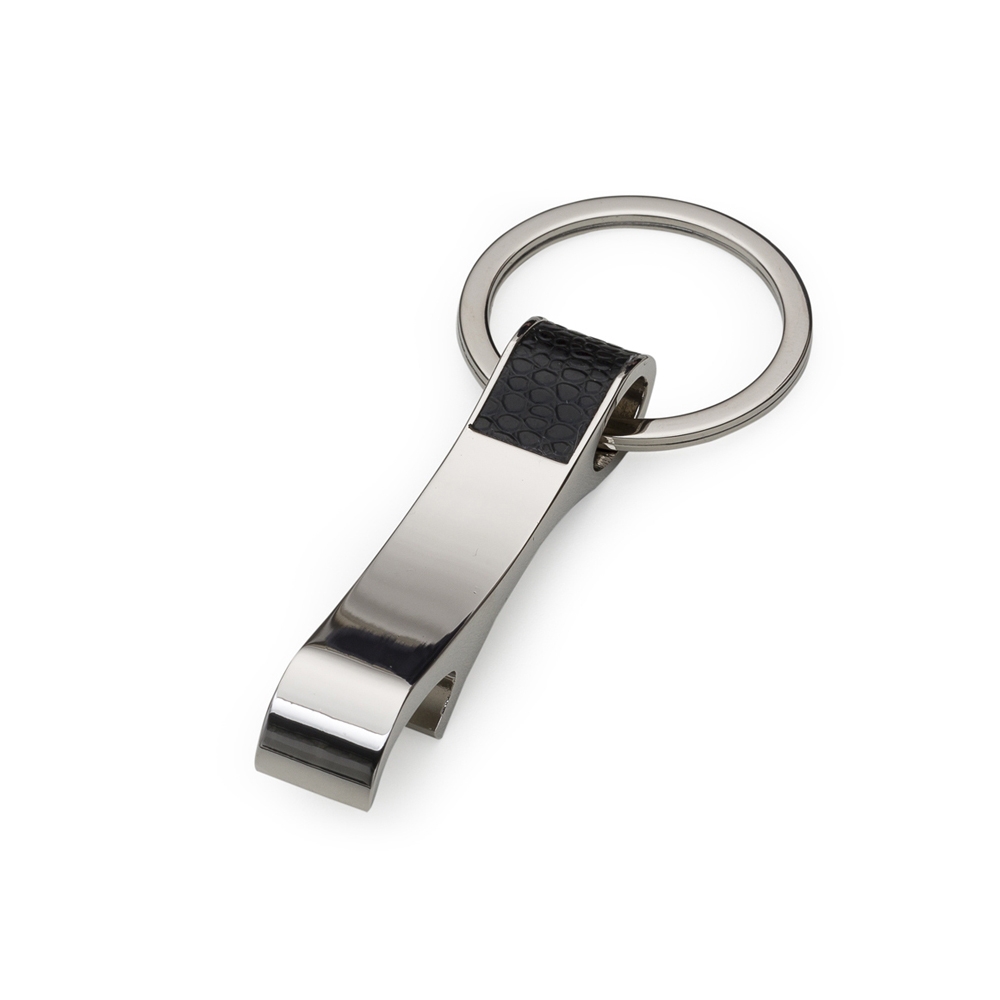 Chaveiro de metal abridor brilhante com detalhe preto em couro no “pegador”. PEDIDO APENAS MÚLTIPLO DE 12 PEÇAS!