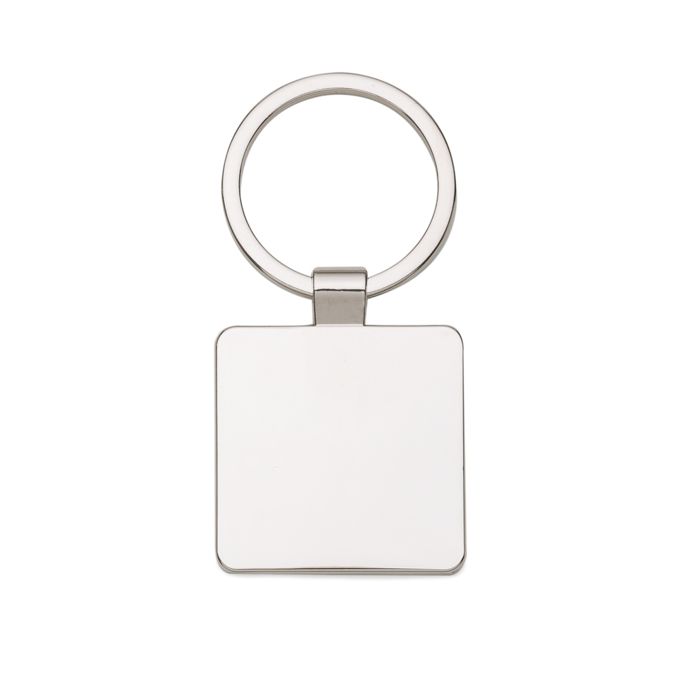 Chaveiro metal retangular com bordar arredondadas. Possui chapa metal central para personalização, verso liso brilhante.