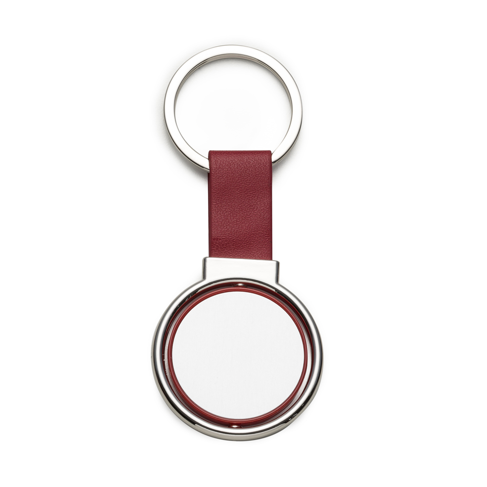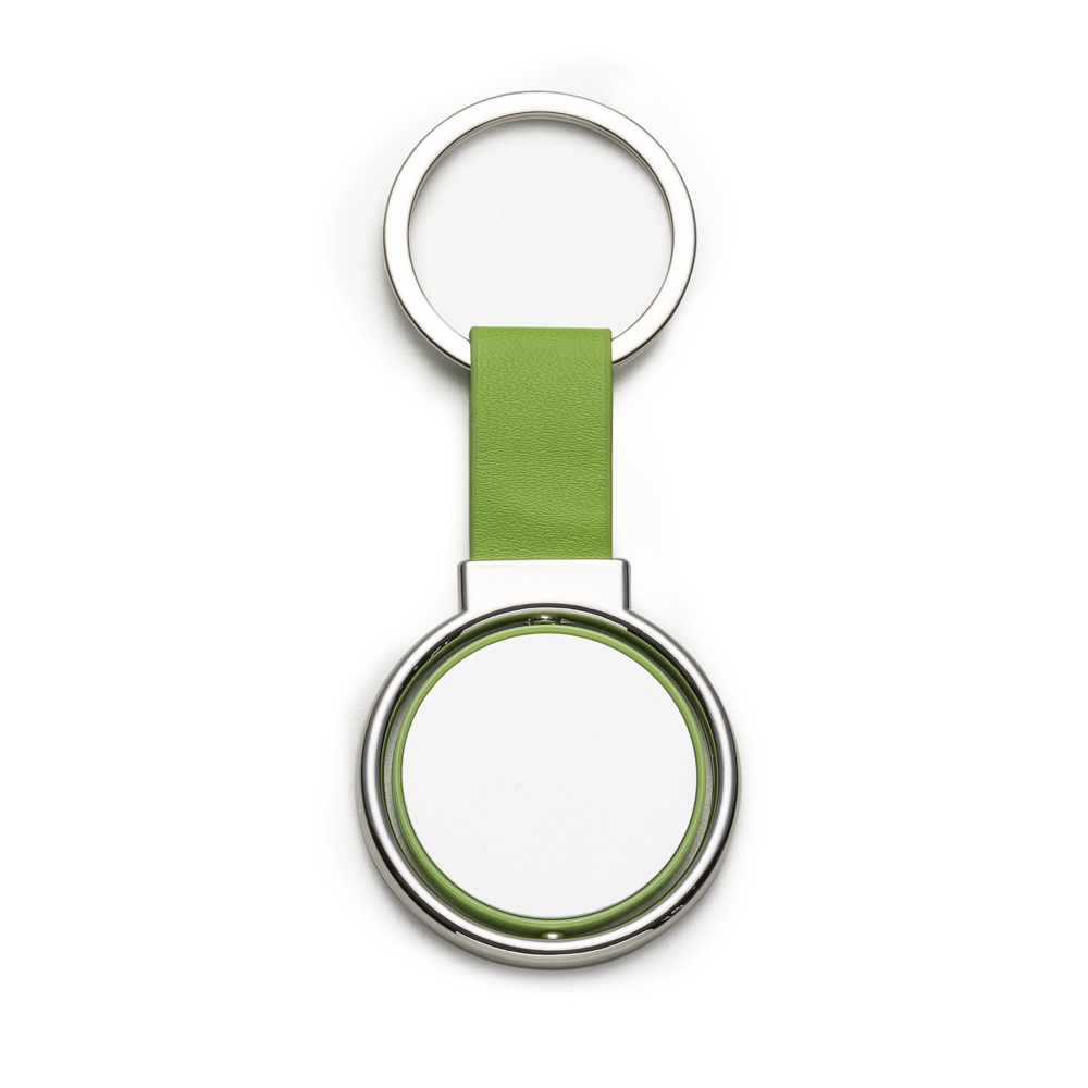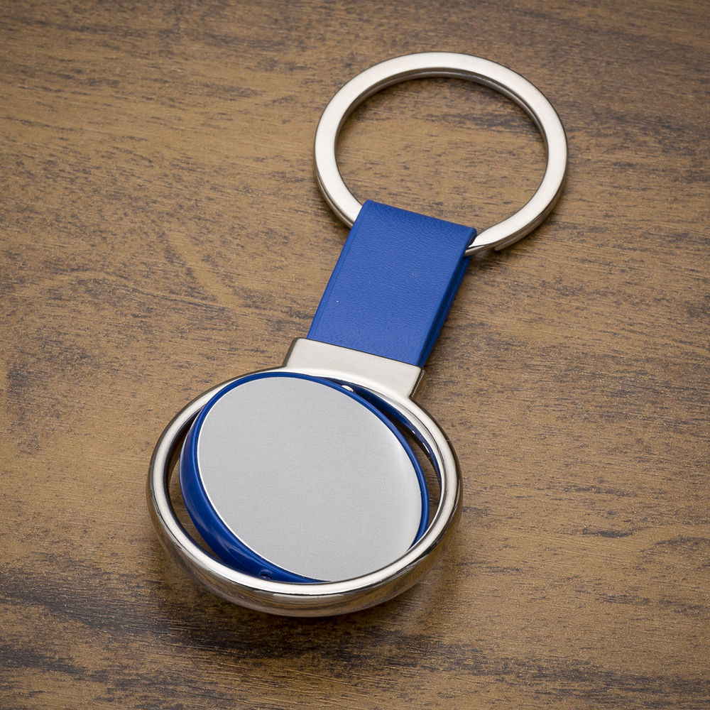 Chaveiro de metal giratório com detalhes coloridos e emborrachado. Circulo central giratório fosco e liso de ambos lados, possui o contorno colorido.