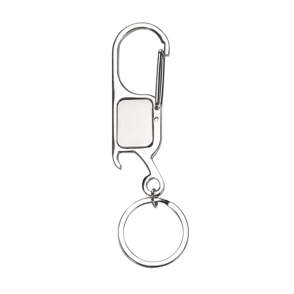 Chaveiro de metal com mosquetão(sem trava). Possui chapa central lisa frente e verso e abridor de garrafa.