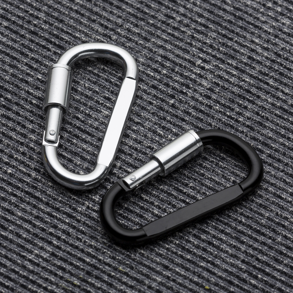 Mosquetão de alumínio com trava(basta rotacionar compartimento), possui lateral reta ideal para personalização.