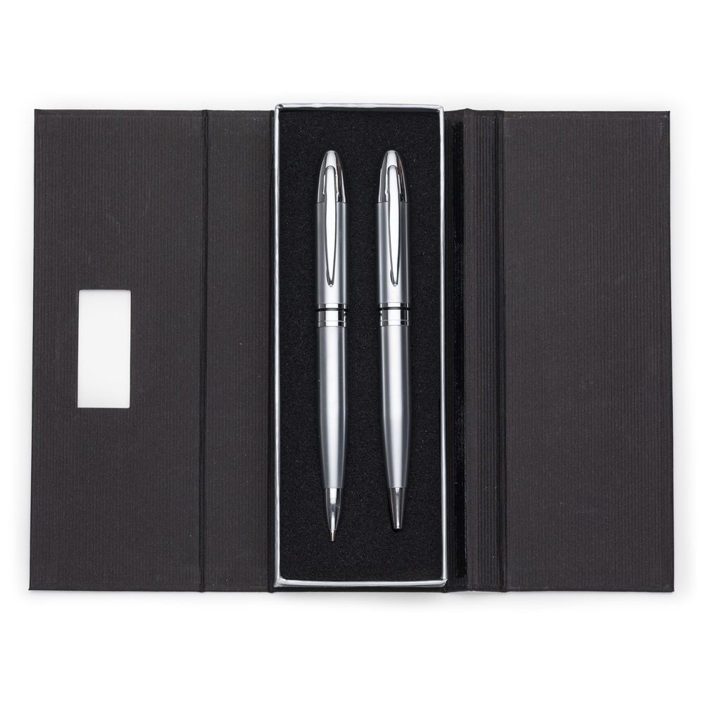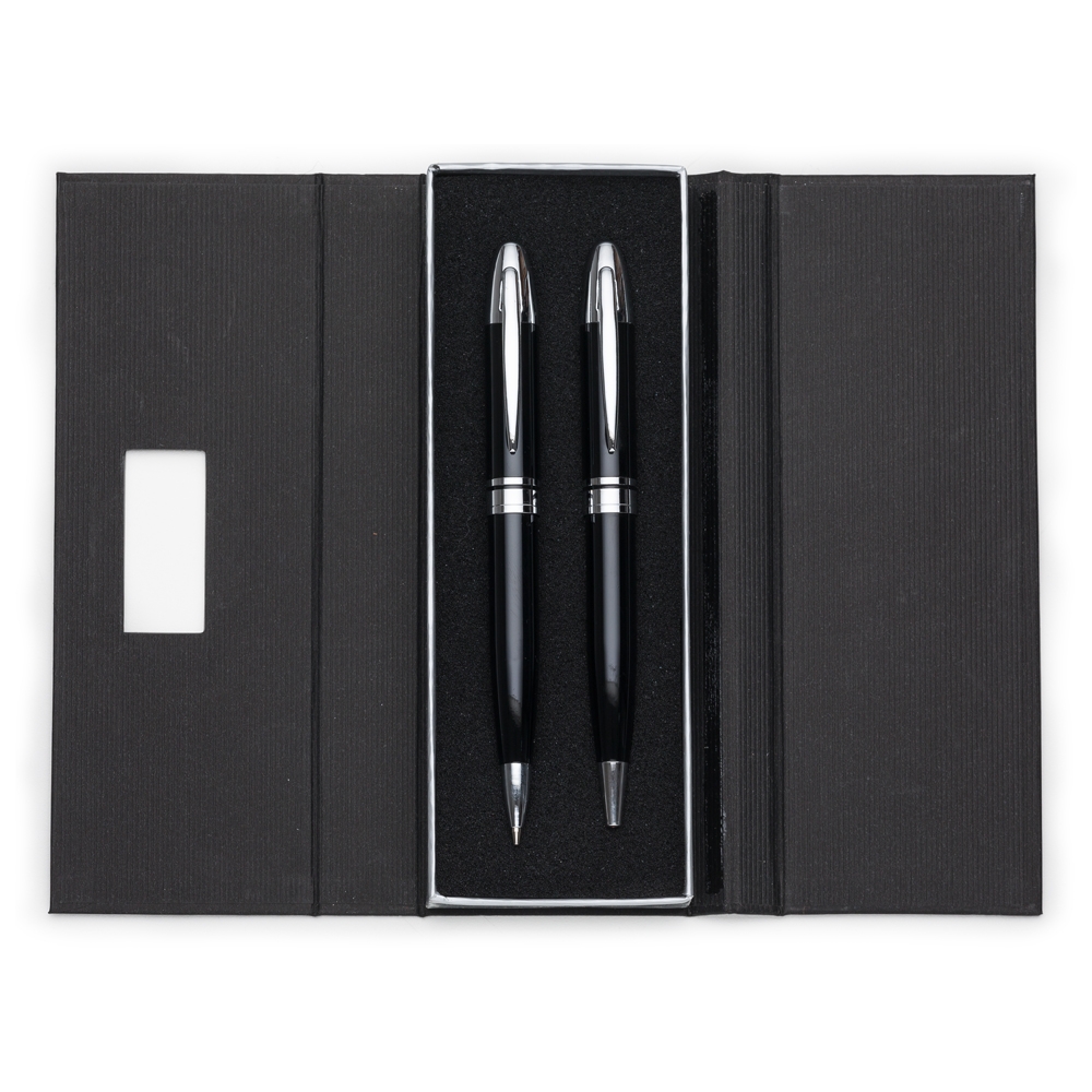 Conjunto caneta e lapiseira em estojo de cartonagem com placa central para personalização. Clip metal e anel central possui: anel fino prata, anel preto fino e um anel maior prata com relevo e acionam por giro. Estojo revestida com espuma na parte interna. Tamanho total aproximado (CxD): Caneta/Lapiseira 14 cm x 1,6 cm – Estojo 18 cm x 6,5 cm. GRAVAÇÃO – laser na placa de metal da caixa, na caneta e na lapiseira