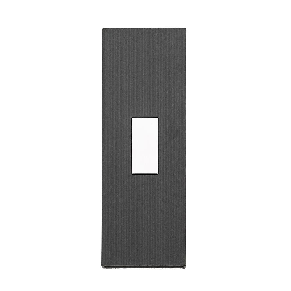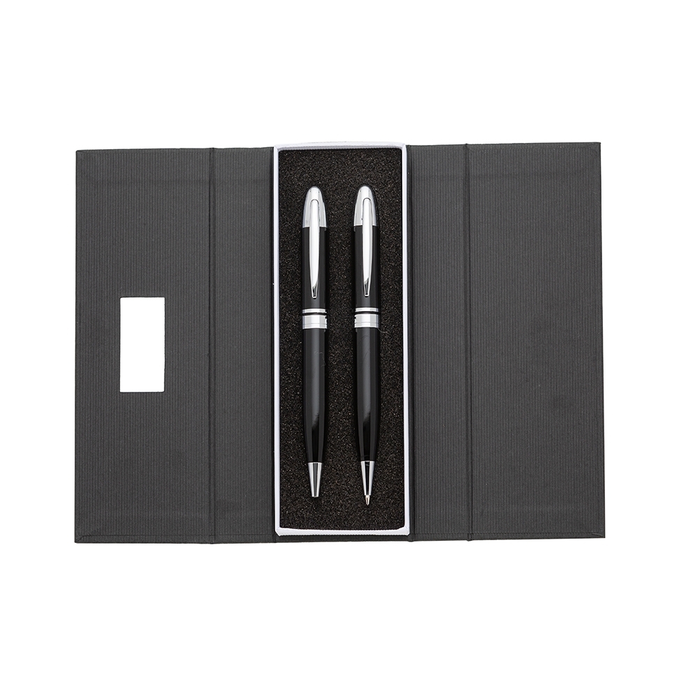 Descrição: Conjunto caneta e lapiseira em estojo de cartonagem com placa central para personalização. Clip metal e anel central possui: anel fino prata, anel preto fino e um anel maior prata com relevo e acionam por giro. Estojo revestida com espuma na parte interna.