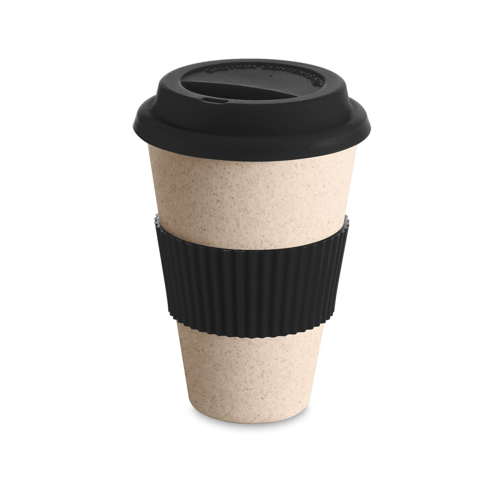 Copo para viagem. Fibra de bambu e fibra de arroz. Com tampa e banda de silicone. Capacidade até 450 ml. Food grade. ø96 x 140 mm