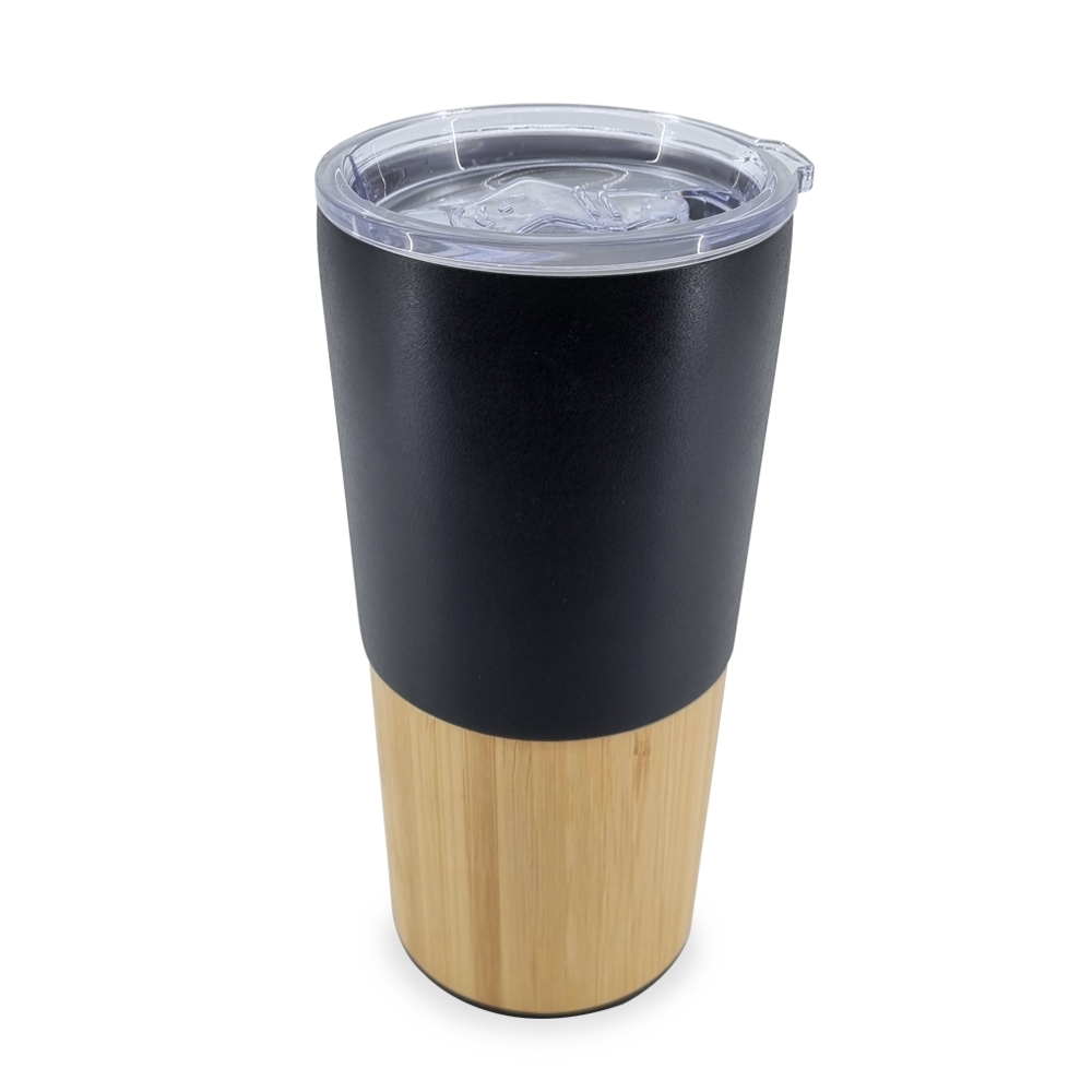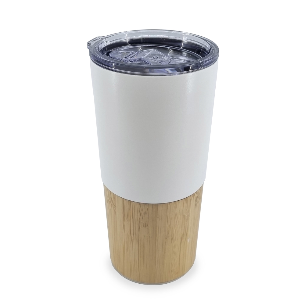 Copo térmico de inox 600ml com parede dupla e detalhe de bambu. Tampa com acesso ao bocal e trava de segurança.