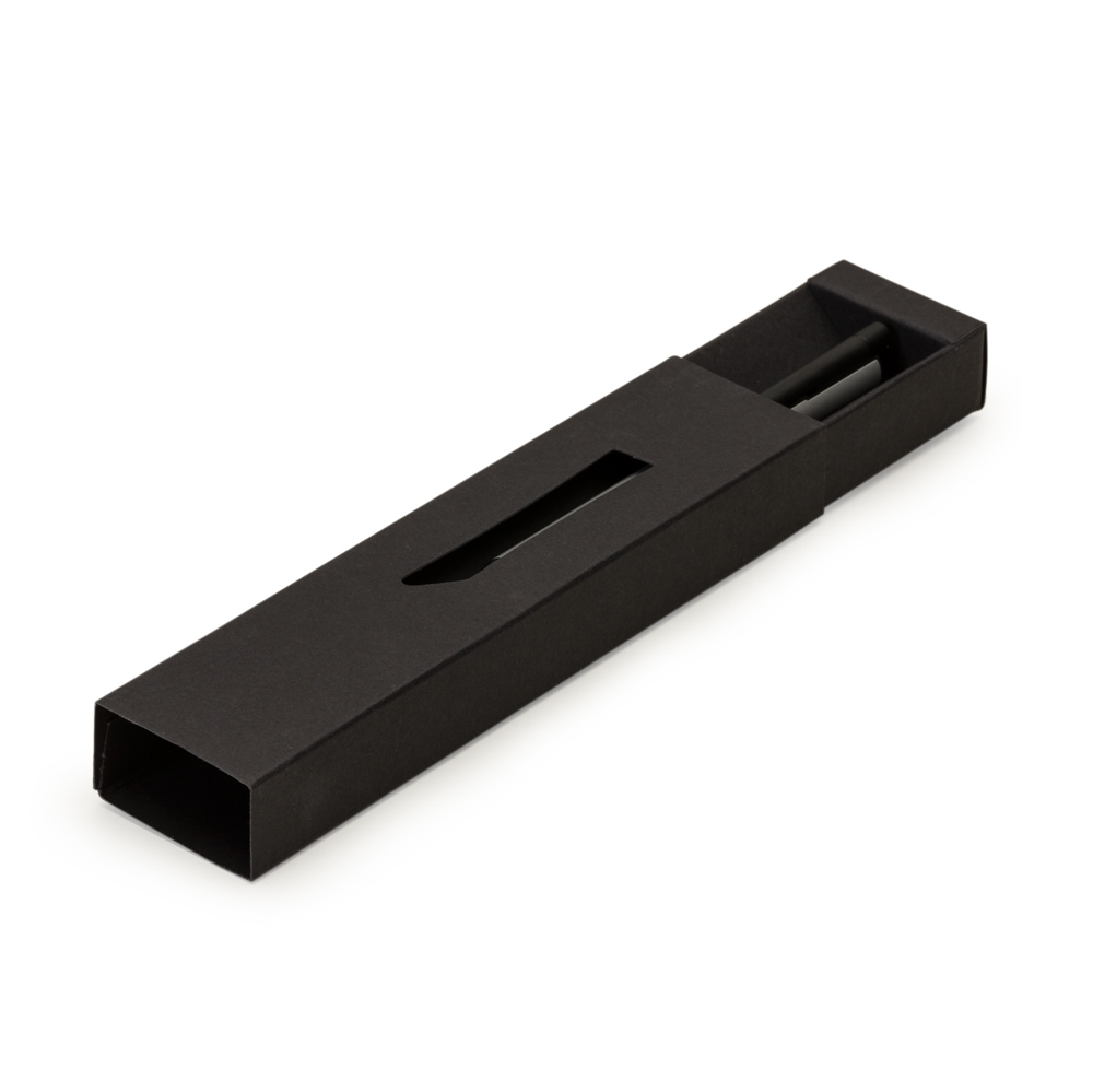 Descrição: Estojo de papel para uma caneta, possui um visor vazado na capa. Parte interna do estojo tem formato triangular.