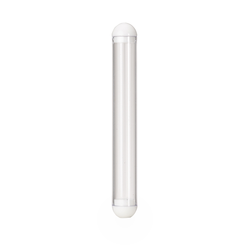 Estojo plástico formato tubo compatível para uma caneta, possui tampas coloridas nas extremidades.