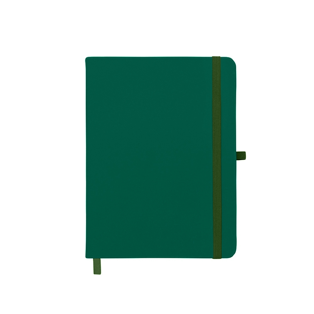 Caderneta tipo moleskine emborrachado com porta caneta em nylon, marcador de página em cetim e fita elástica para lacre. Contém aproximadamente 80 folhas pardas com pauta.