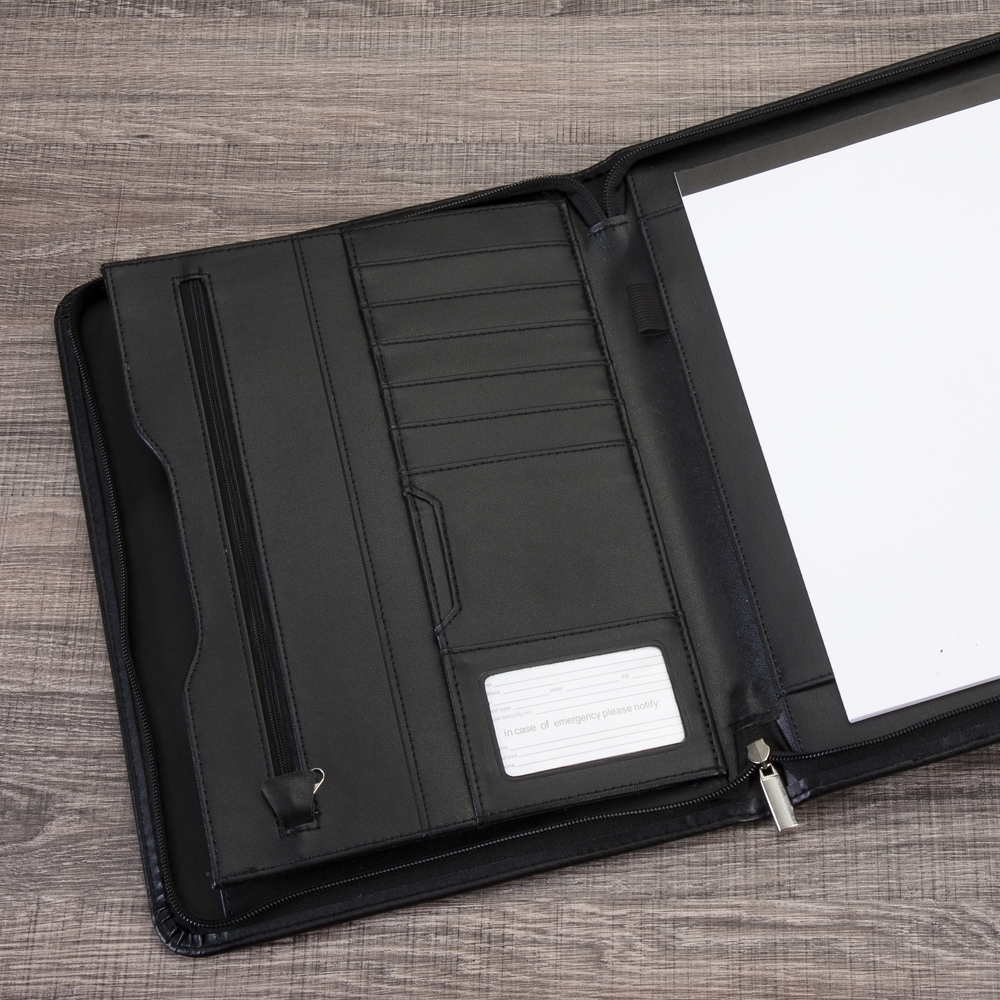 Pasta convenção de material sintetico (imitação de couro) com zíper, possui 2 compartimentos grandes para arquivar documentos, compartimento interno com zíper, 7 divisórias pequenas para documentos, suporte com visor para cartão de identificação, suporte para caneta(não acompanha caneta) e bloco com 20 folhas pautadas.
