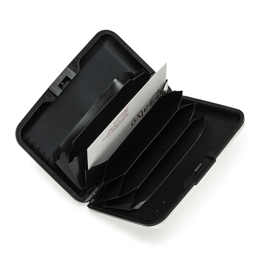 Porta cartão plástico com 7 divisórias internas. Frente e verso liso, possui botão central com seta indicativa para abertura.