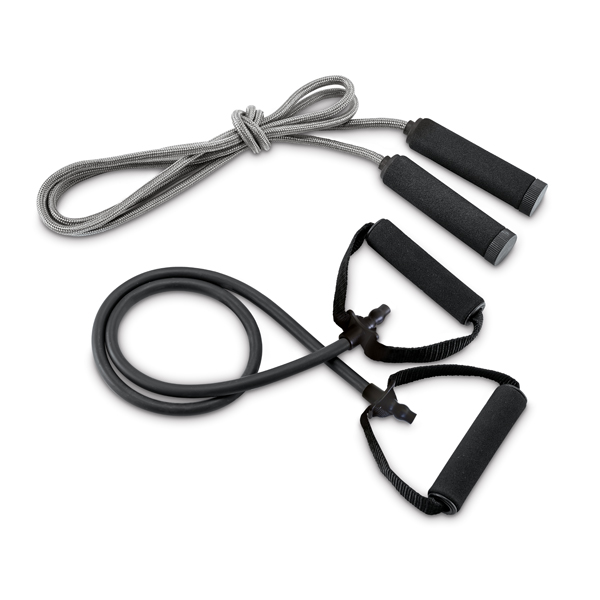 Kit fitness. Incluso elástico e corda de pular. Fornecido com bolsa em 190T. Bolsa: 210 x 270 mm