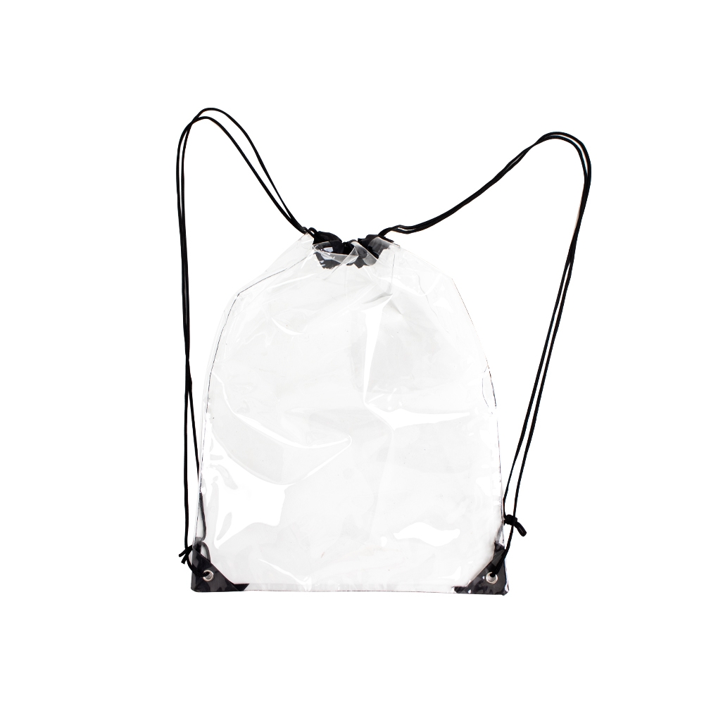 Descrição: Mochila Saco em PVC transparente com detalhes em tecido nylon, alças reguláveis e dois ilhós metálicos.