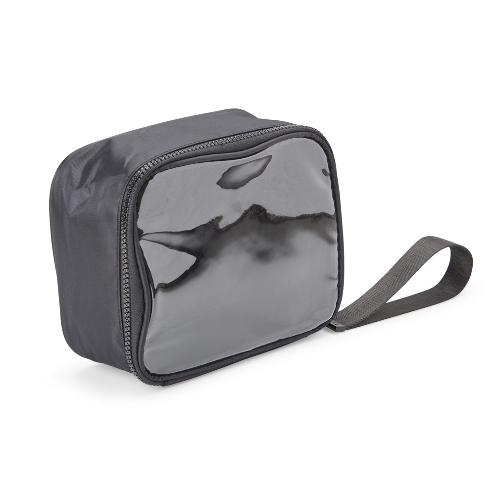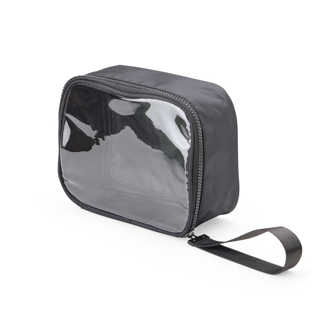 Descrição: Nécessaire confeccionada em nylon, com frente em visor transparente, fechamento por zíper e alça superior. Inclui também uma alça de transporte em nylon.