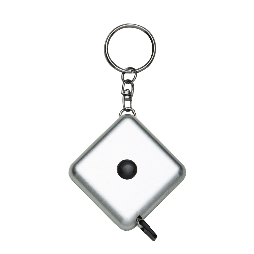 Fita métrica de 1 metro em plástico quadrangular, frente lisa e verso com botão(trava) preto. Acompanha chaveiro.