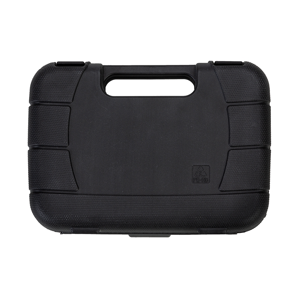 Kit ferramenta 8 peças em estojo plástico. Maleta plástica com detalhe retangular no centro frontal e verso liso, possui texturização no estojo e duas travas superiores. Acompanha: fita isolante, martelo, alicate, chave Philips, chave teste, chave de fenda, trena 2 metros e estilete.