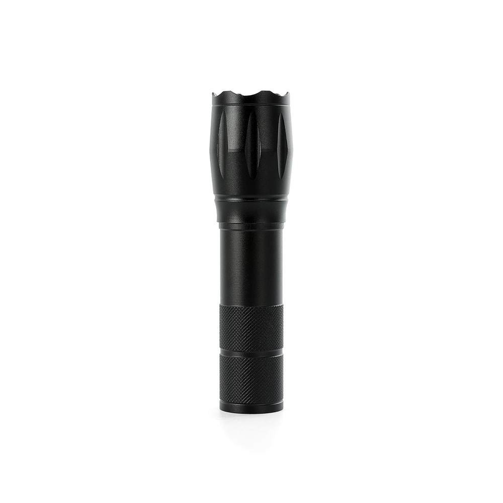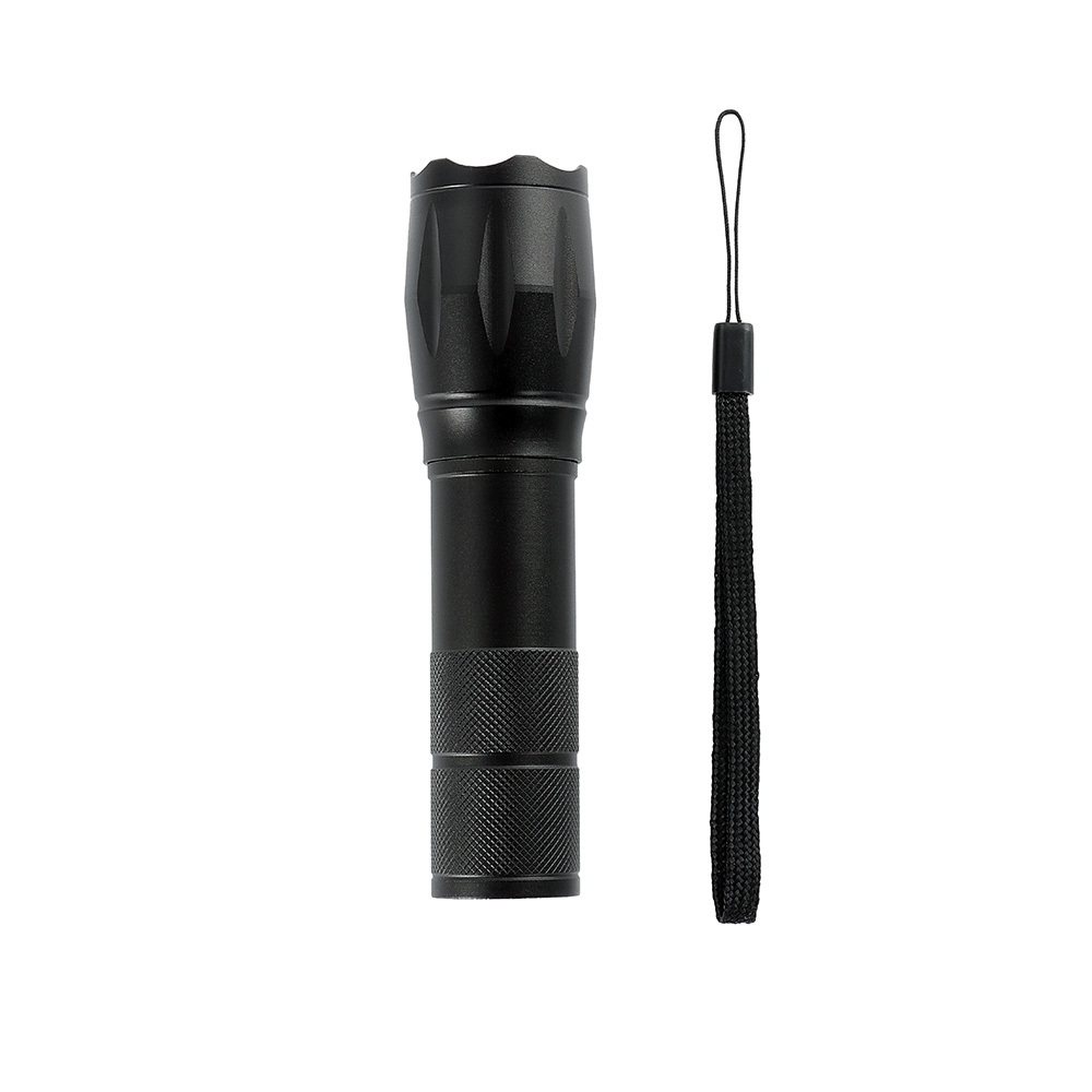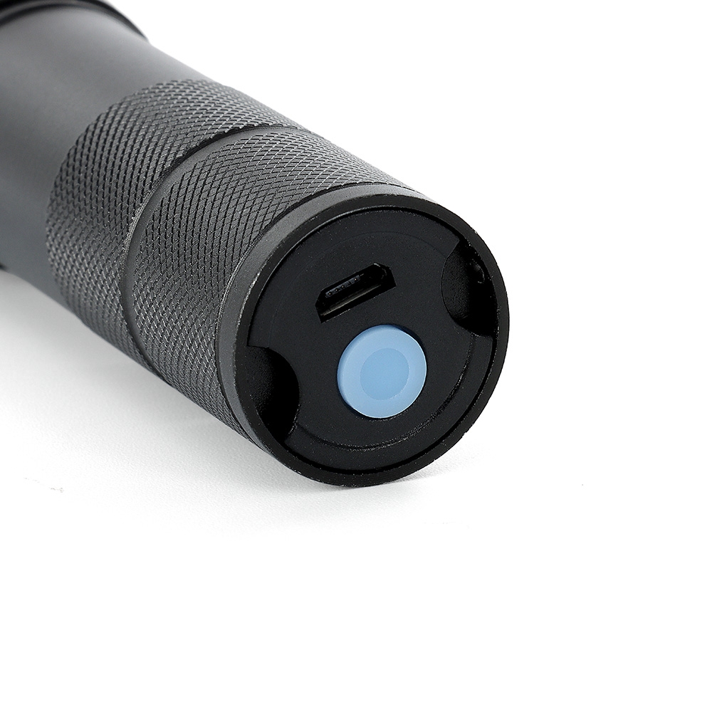 Descrição: Lanterna led recarregável com zoom de regulagem e três estágios de iluminação, material metálico. Acompanha cordão de nylon e cabo USB-V8.