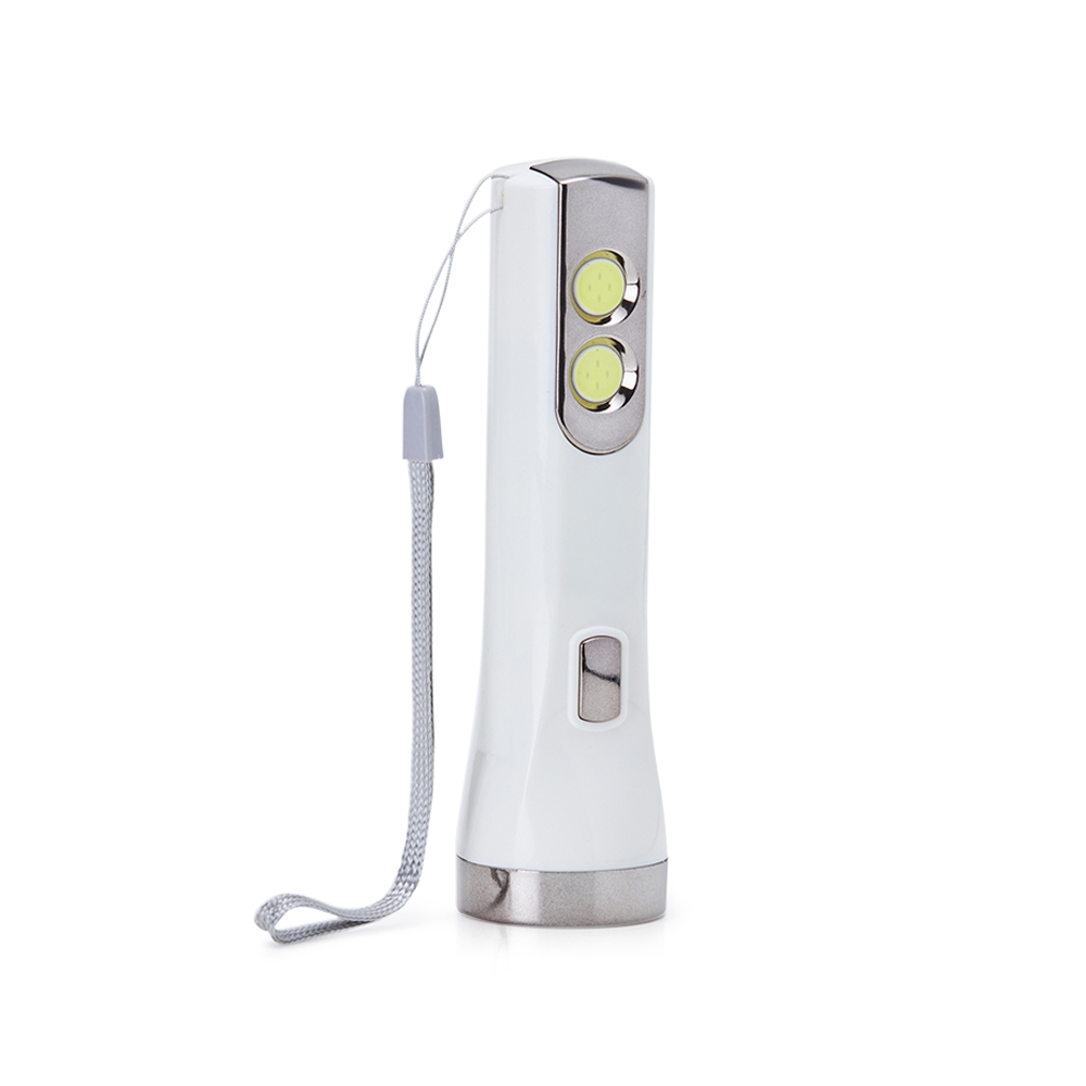 Descrição: Lanterna plástica recarregável de um led com 3 estágios de iluminação e dois leds lateriais com função luminária. Possui cordão de nylon para transporte e acompanha cabo usb.