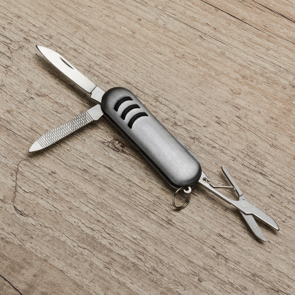 Mini canivete metal 3 funções com detalhes emborrachados preto(três linhas frente e verso). Possui: lixa, lâmina de corte e mini tesoura e acompanha pequena argola para utilizar como chaveiro.