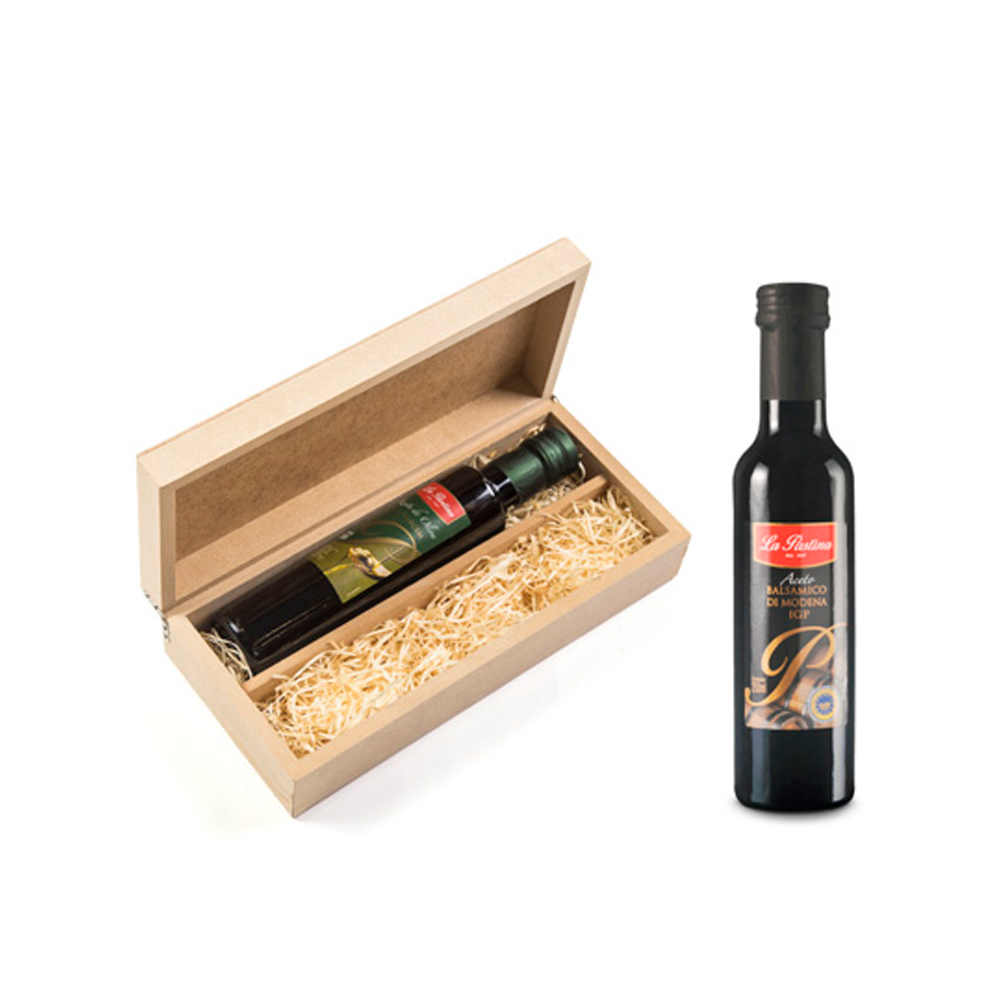 home / produtos / Gourmet / Kit 1 Azeite e 1 Balsâmico La Pastina na caixa de MDF - C2AZE510