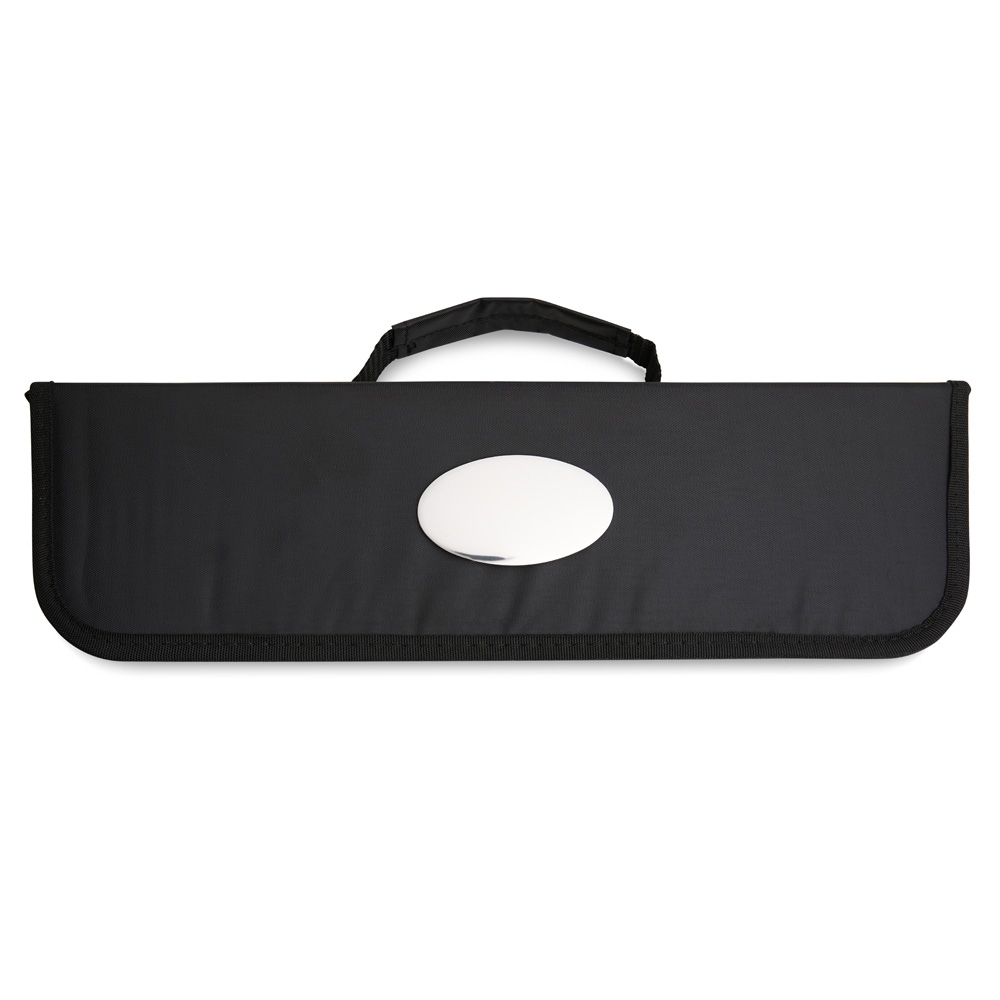 Descrição: Praticidade para qualquer churrasco! Este kit conta com quatro peças essenciais: espátula, garfo, pegador e faca de 6 polegadas, todas em aço inox com cabos de madeira, acomodadas em um estojo de nylon que facilita o armazenamento e transporte. Para maior exclusividade, acompanha uma plaquinha metálica personalizável com verso autoadesivo.