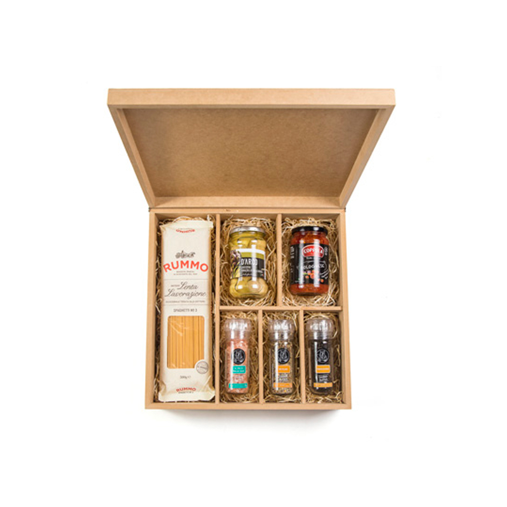 home / produtos / Gourmet / Kit Massa, Molho, Aperitivo e 3 Moedores na caixa de MDF - C2MAS122