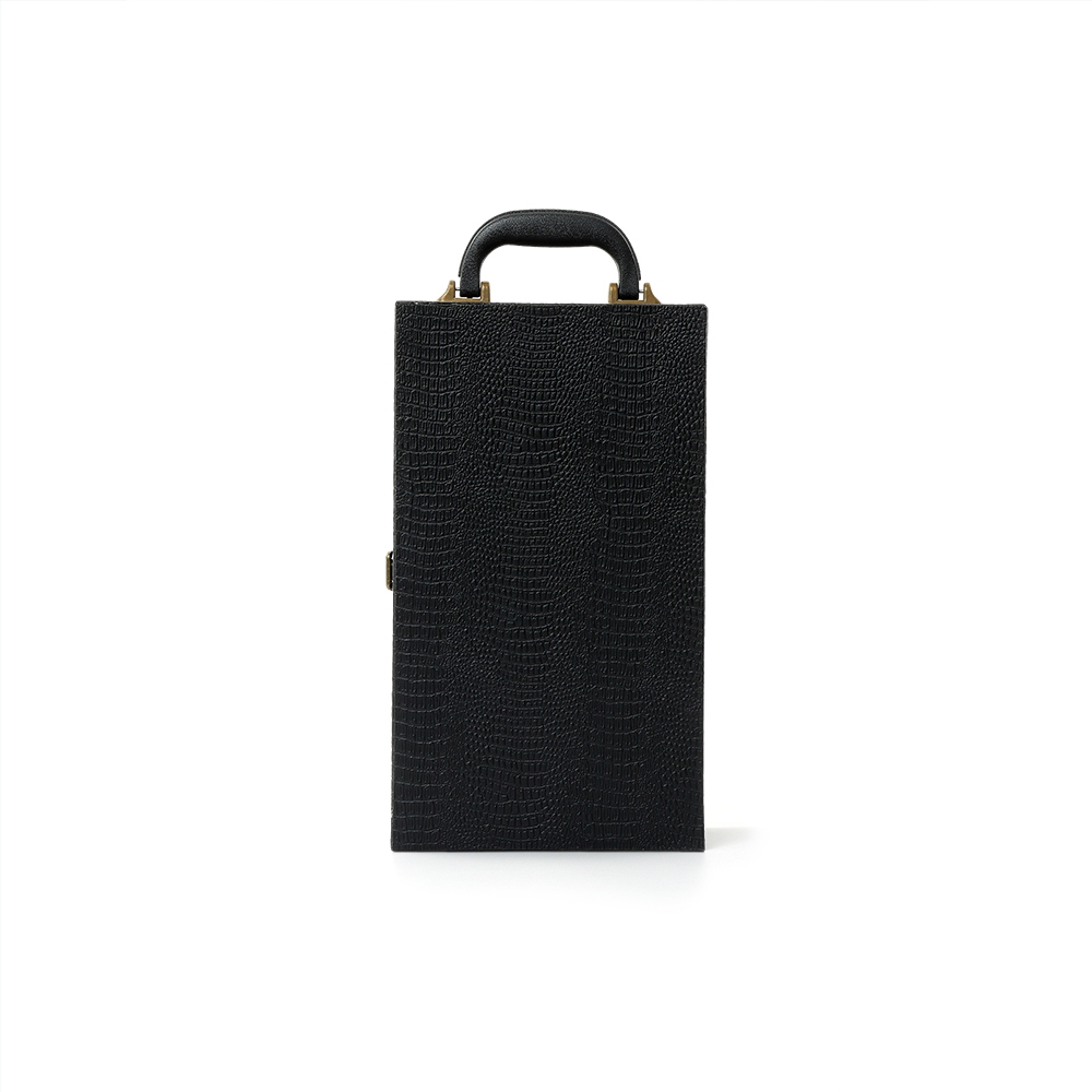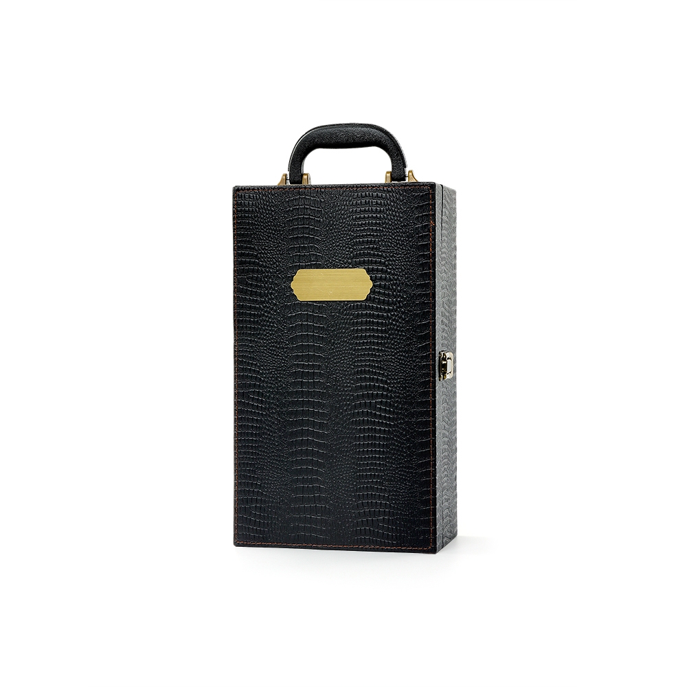 Descrição: Kit vinho 4 peças em maleta de couro sintético com relevo. Possui: saca-rolhas metálico, bico condutor com tampa metálico, cortador de lacre e wine collar. Parte interna revestida de veludo, duas repartições para garrafas, possui suporte em nylon com velcro em cada lado da repartição para fixar garrafa de vinho, alça de couro na lateral e trava metálica. Acompanha plaqueta de metal para personalização.