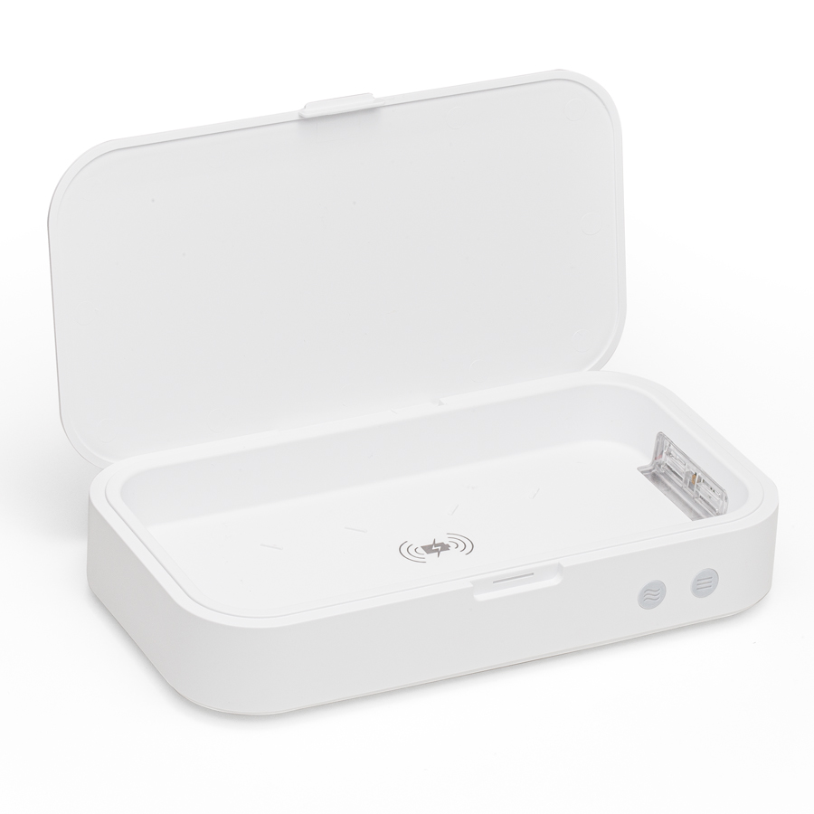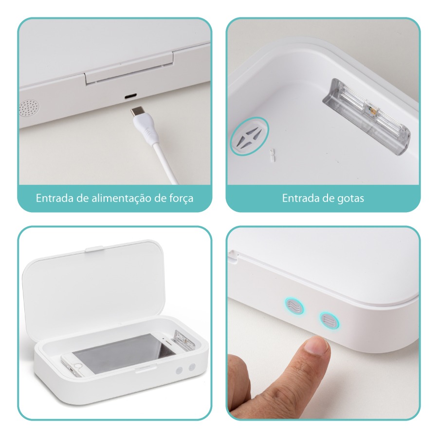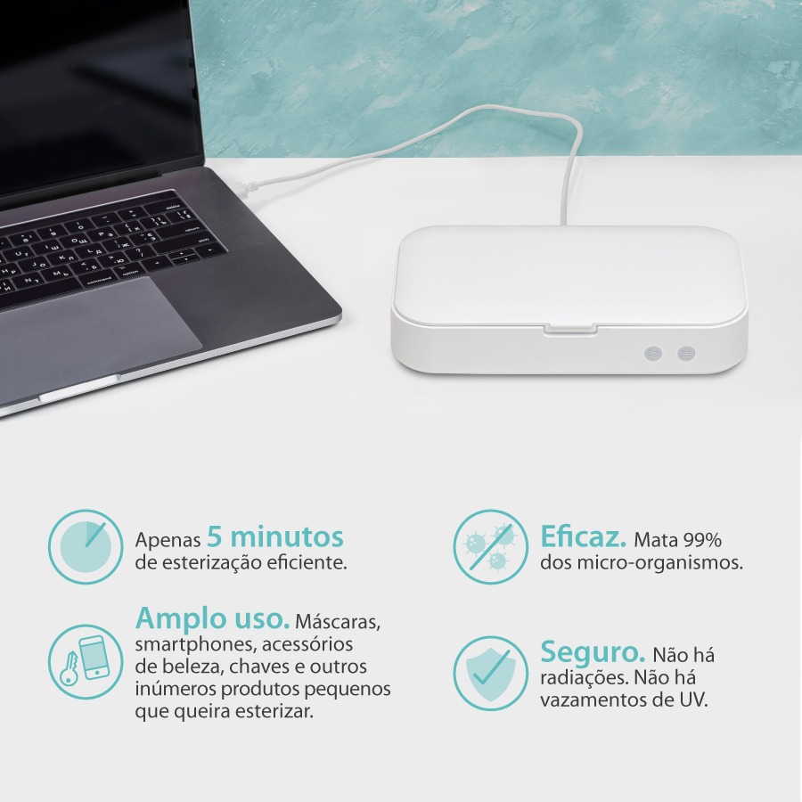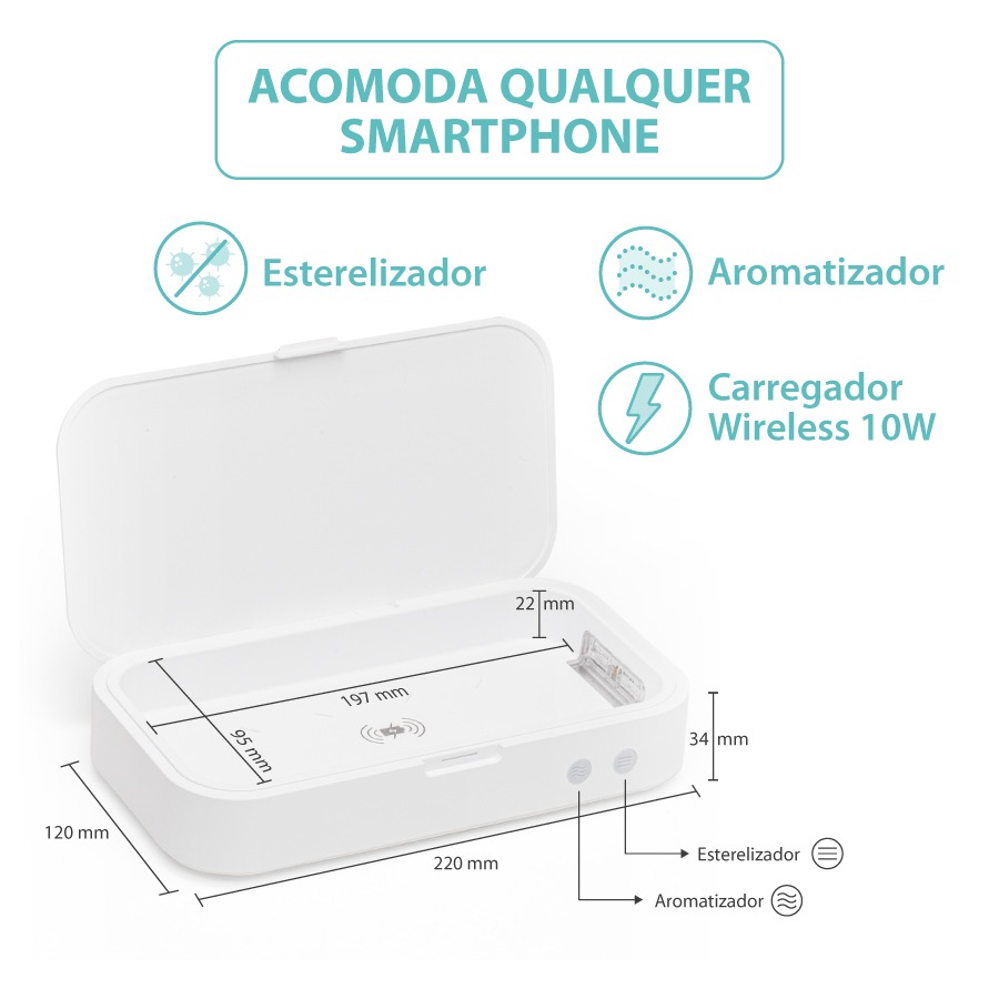 Caixa de Esterilização Multifuncional UVC. Com taxa de desinfecção de até 99%, pode esterilizar seu smartphone, sua máscara e outros pequenos objetos do dia a dia como joias, relógios, chaves, fone de ouvido, óculos, cartão de credito e outros. É também um carregador wireless para aparelhos compatíveis com tecnologia QI (smartphones e estojo de recarga para fone de ouvido). Potência de carregamento 10w. Ele carrega enquanto faz a desinfecção e a aromaterapia também. Possui ainda recurso de aromaterapia (perfuma apenas o objeto dentro da caixa esterilizadora – óleo essencial não incluso). Incluso cabo tipo C e pano para limpeza numa linda caixa tipo presente. Testado em laboratório e certificado pela CE, FCC e Rohs.
