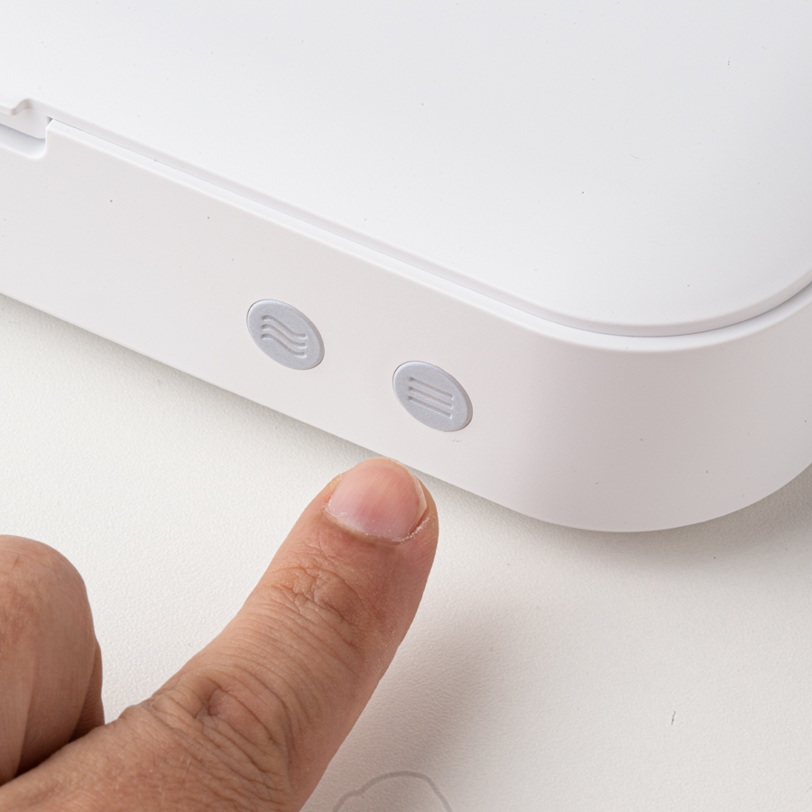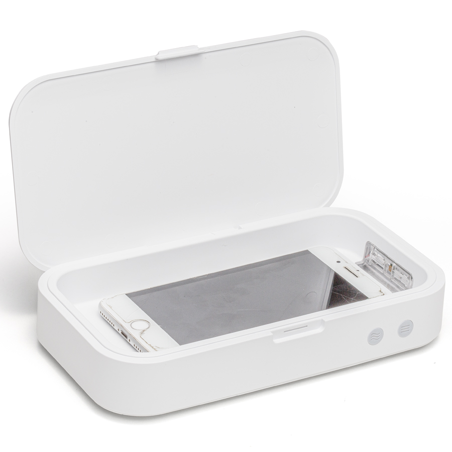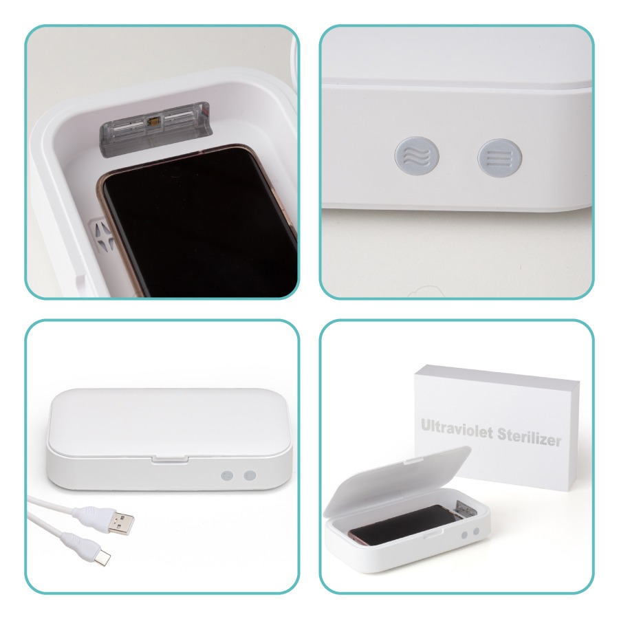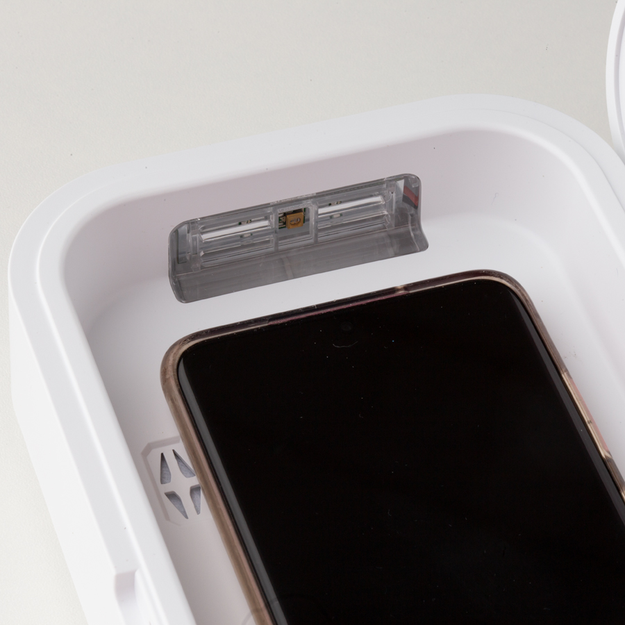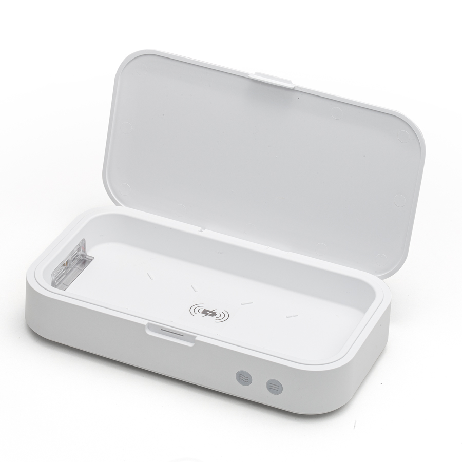 Caixa de Esterilização Multifuncional UVC. Com taxa de desinfecção de até 99%, pode esterilizar seu smartphone, sua máscara e outros pequenos objetos do dia a dia como joias, relógios, chaves, fone de ouvido, óculos, cartão de credito e outros. É também um carregador wireless para aparelhos compatíveis com tecnologia QI (smartphones e estojo de recarga para fone de ouvido). Potência de carregamento 10w. Ele carrega enquanto faz a desinfecção e a aromaterapia também. Possui ainda recurso de aromaterapia (perfuma apenas o objeto dentro da caixa esterilizadora – óleo essencial não incluso). Incluso cabo tipo C e pano para limpeza numa linda caixa tipo presente. Testado em laboratório e certificado pela CE, FCC e Rohs.