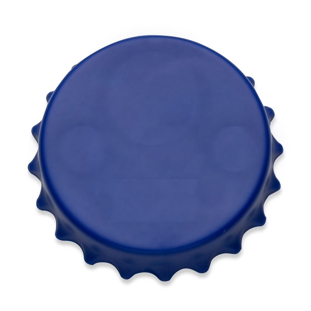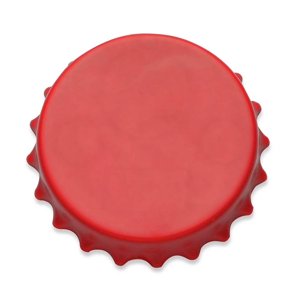 Abridor de garrafa formato tampa, material plástico resistente com imã de geladeira. Parte traseira possui abridor tradicional e abridor para long neck.