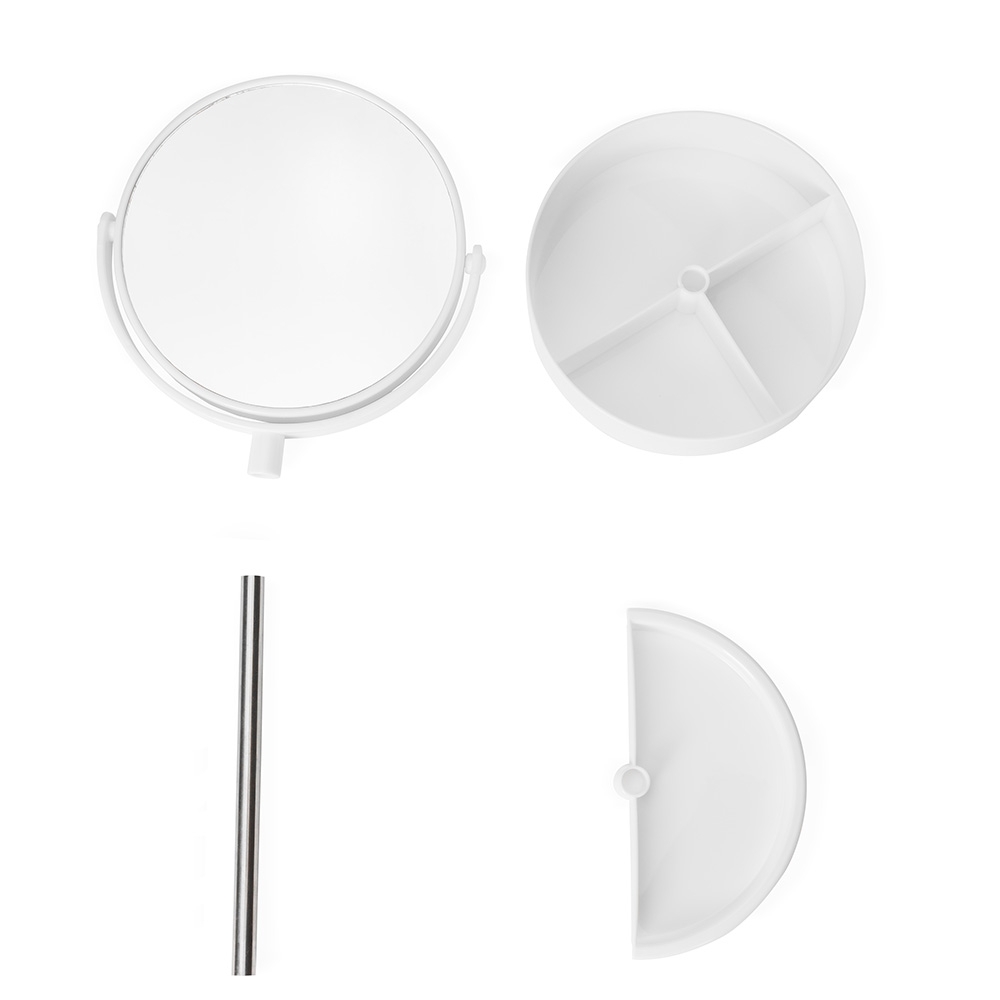 Descrição: Espelho de mesa dupla face giratório com design moderno e funcional. Com base e moldura de plástico e pedestal de alumínio, ele é fácil de montar e adequa-se bem a qualquer ambiente. Sua base contém três divisórias para guardar objetos diversos.
