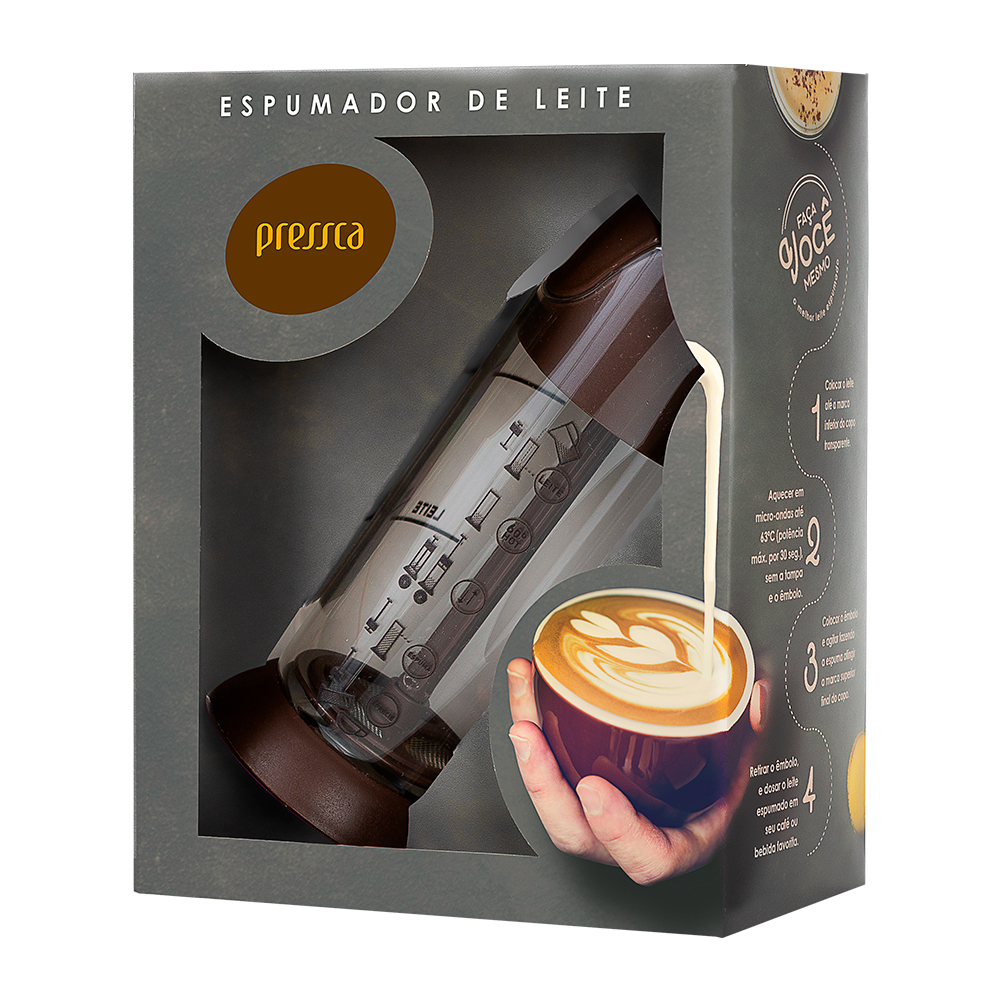 Com o Espumador de Leite Pressca você prepara em casa deliciosas receitas de Latte, Cappucino, Mochas e Macchiatos. Rápido e fácil de usar: basta aquecer o leite e mover o êmbolo para cima e para baixo até dobrar o volume da espuma. Use também com leite vegetal como o de soja, amêndoas ou castanhas, e no preparo de drinks e shakes. Livre de BPA. Pode ser levado ao micro-ondas. Surpreenda seus amigos!