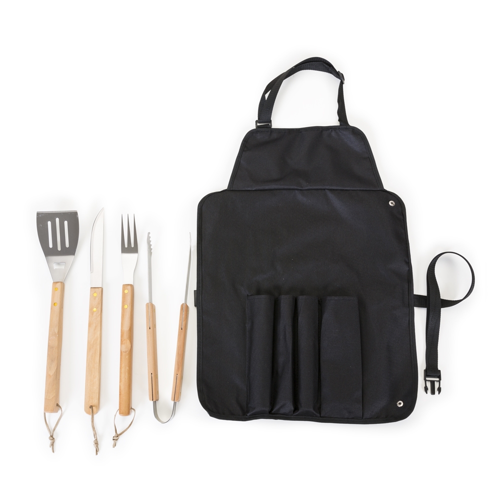 Kit churrasco com 4 peças, avental em nylon com botões e alça travável para fechar o kit. Peças de inox com acabamento em madeira e acompanha protetores plásticos anti-furo, possui: espátula, garfo, faca e pegador.