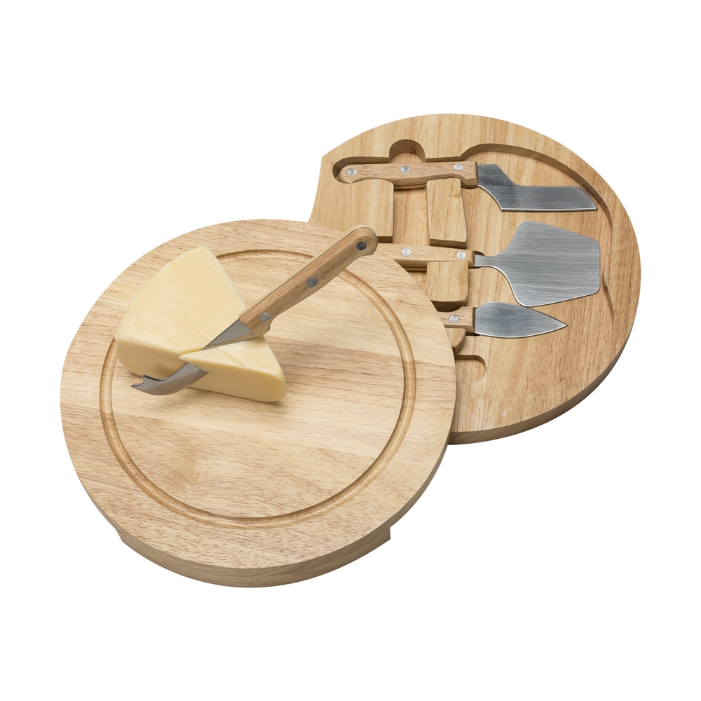 Kit queijo 5 peças com tábua de madeira, possui detalhe circular em relevo na parte superior e parte inferior com borrachas anti deslizantes. Possui: faca reta, espátula, faca com ponta e garfo em inox e cabo madeira. Para abrir basta rotacionar a tampa. observação: Tábua 25,6 cm x 25,6 cm - Faca reta 18,5 cm x 4,5 cm – Espátula 19,2 cm x 7 cm – Faca com ponta 16,2 cm x 2,8 cm – Garfo 18,3 cm x 3,4 cm