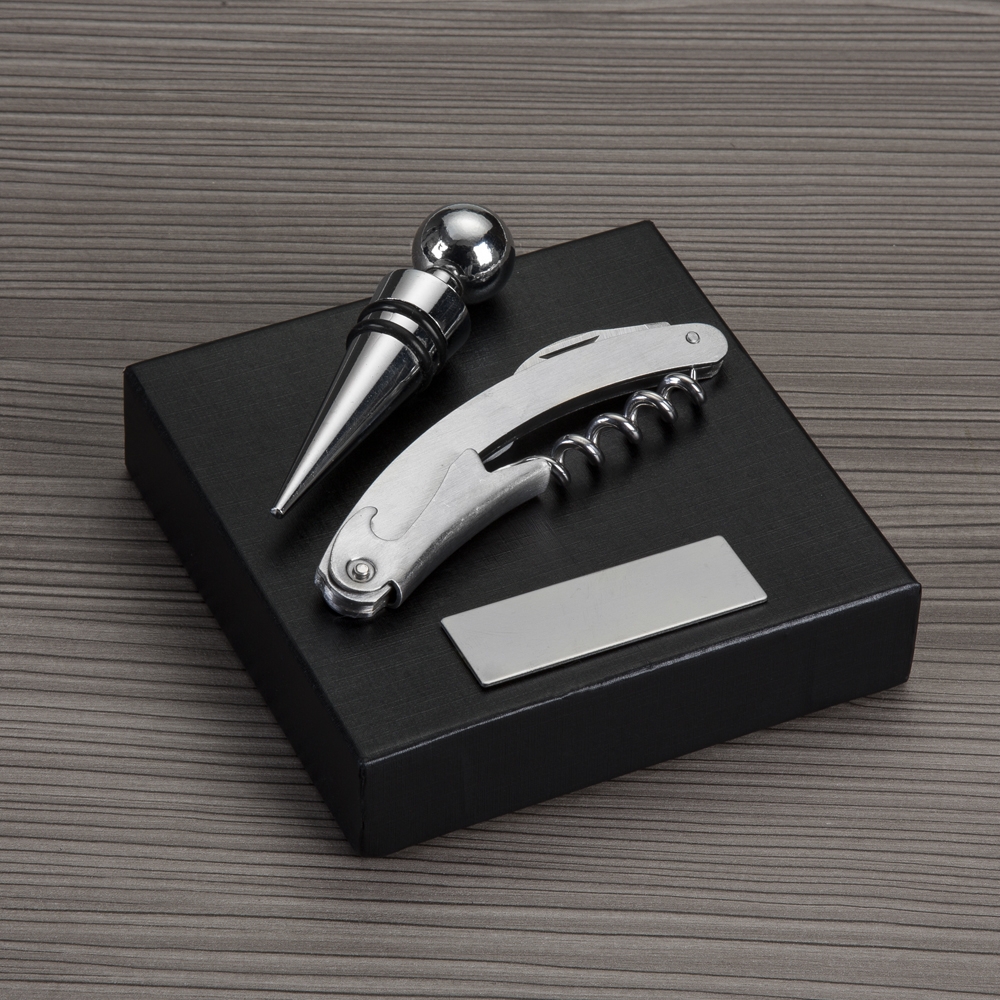 Kit vinho 2 peças em caixa de papelão com tampa, revestimento interno de espuma. Possui saca rolhas de metal e tampa de bico.