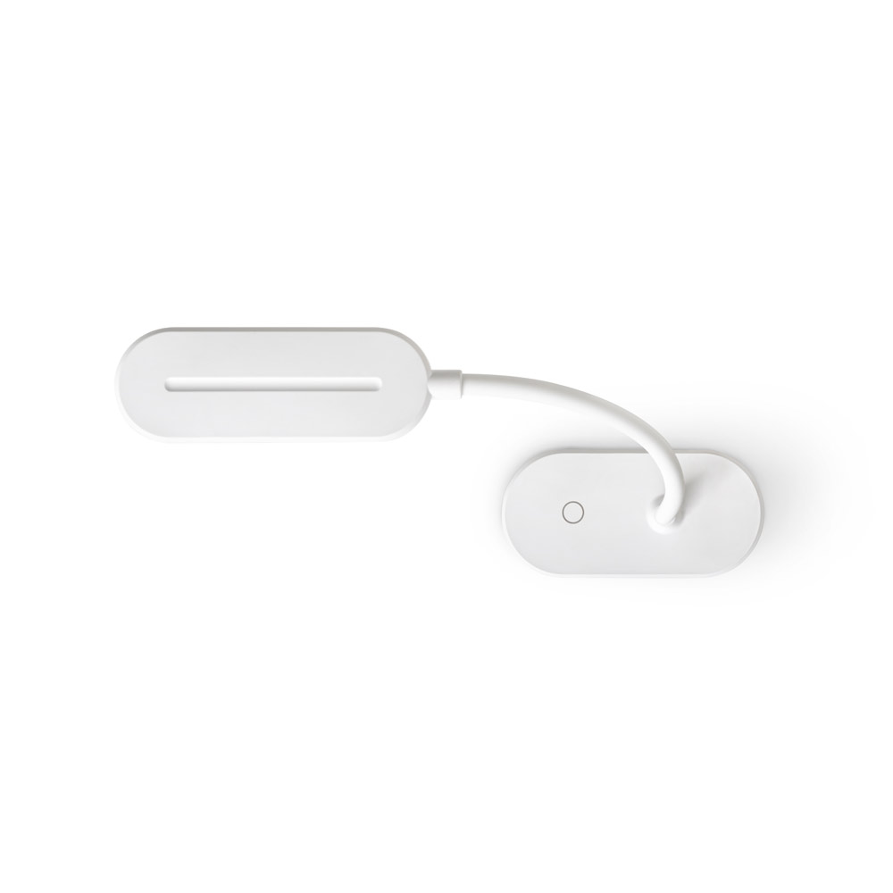 Luminária de mesa portátil em ABS 65% reciclado com 140 lumen e clip para segurar às superfícies. A base é antiderrapante e o tubo é maleável em 360º que permite ajustar com facilidade a direção da luz. Tem uma bateria incorporada de lítio de 1200 mAh. Contém um interruptor para ligar e desligar com 3 níveis de luminosidade: Luz alta (aproximadamente 3 h de utilização), luz média (aproximadamente 7 h de utilização) e luz baixa (aproximadamente 30 h de utilização). Incluso um cabo de carregamento USB-C. Fornecida em caixa presente em papel kraft reciclado. 122 x 456 x 58 mm | Caixa: 110 x 75 x 180 mm