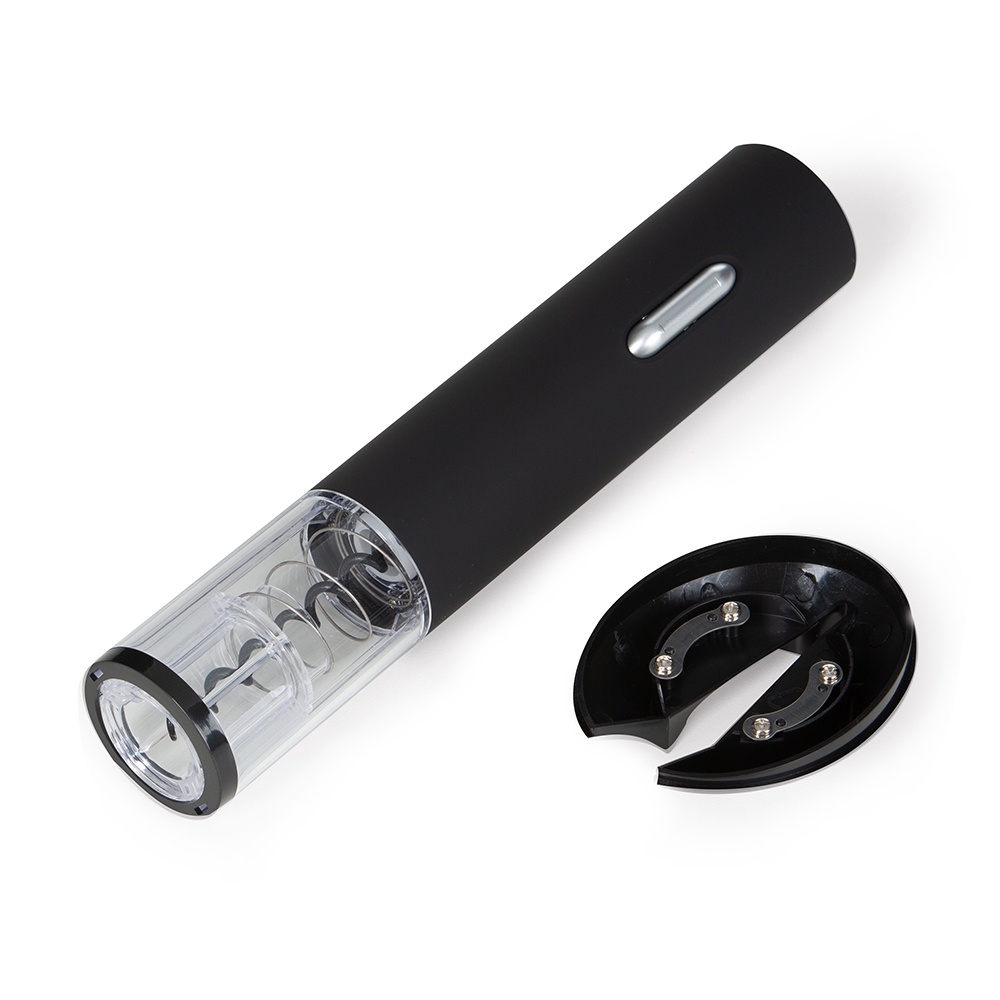 Saca rolhas com cortador de lacre. Parte superior emborrachada e parte inferior acrílica, possui compartimento na parte posterior para 4 pilhas AA. Parte inferior com cortador de lacre (removível).