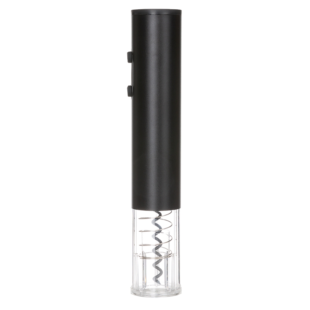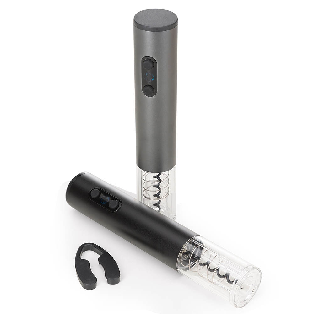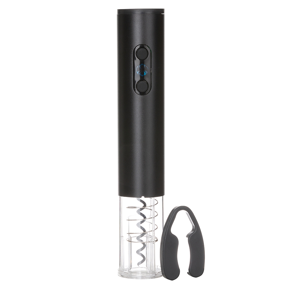 Saca Rolhas elétrico com LED. Acompanha cortador de lacre. Possui compartimento para 4 pilhas AA na parte superior, botões para extração e remoção de rolhas.