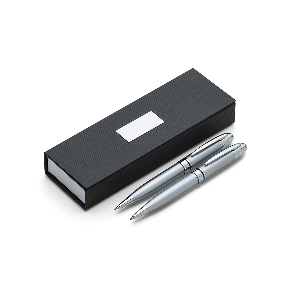 Conjunto caneta e lapiseira em estojo de cartonagem com placa central para personalização. Clip metal e anel central possui: anel fino prata, anel preto fino e um anel maior prata com relevo e acionam por giro. Estojo revestida com espuma na parte interna.