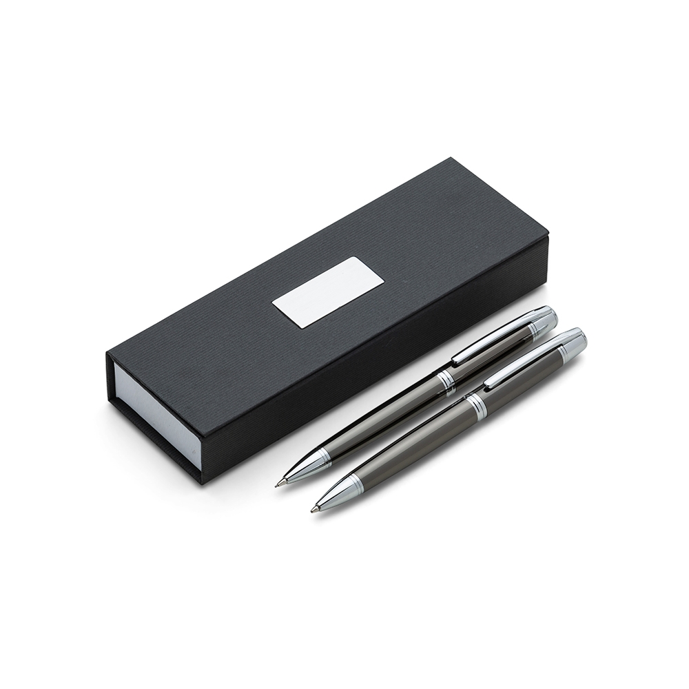 Conjunto caneta e lapiseira em estojo de cartonagem com placa central para personalização. Clip metal com dois anéis em relevo, anel centralizado e dois anéis em relevo na ponteira e acionam por giro. Estojo revestida com espuma na parte interna.
