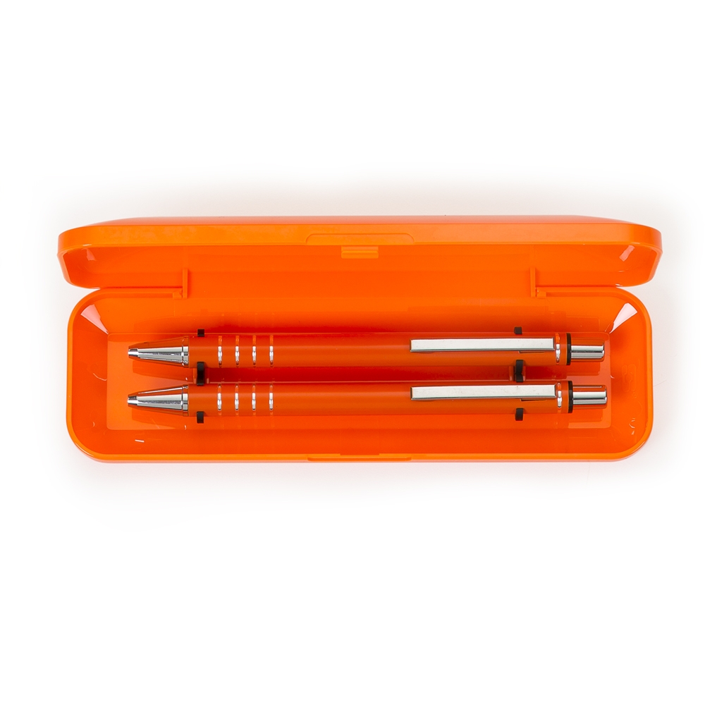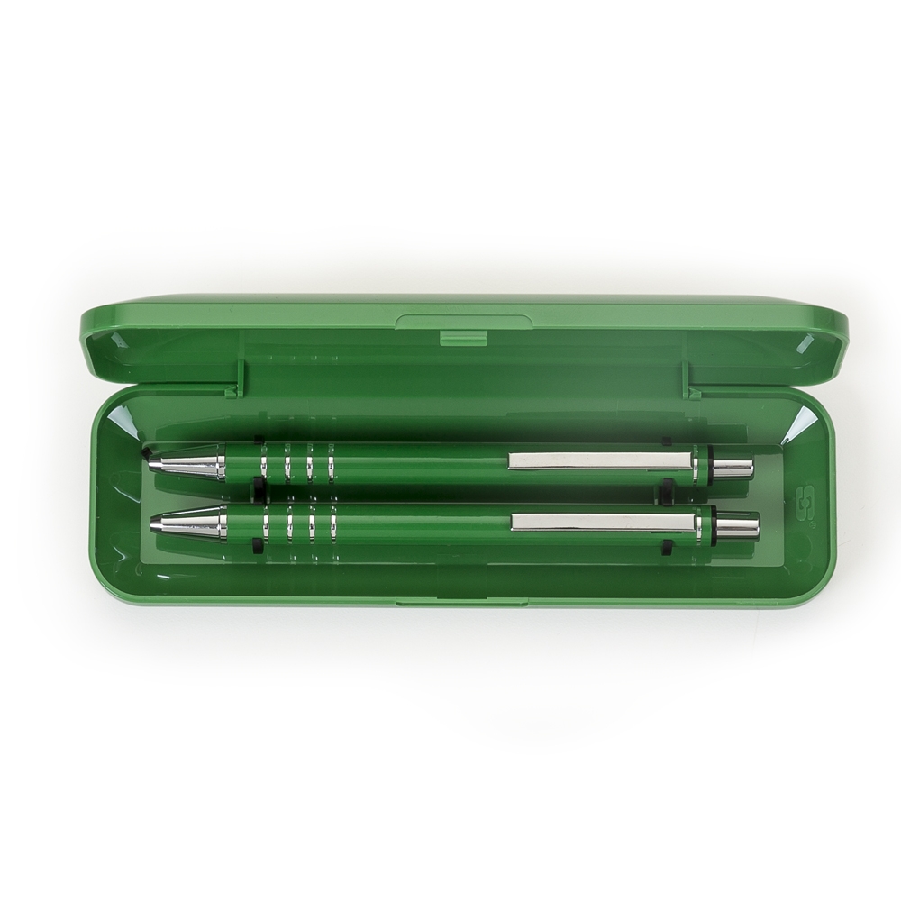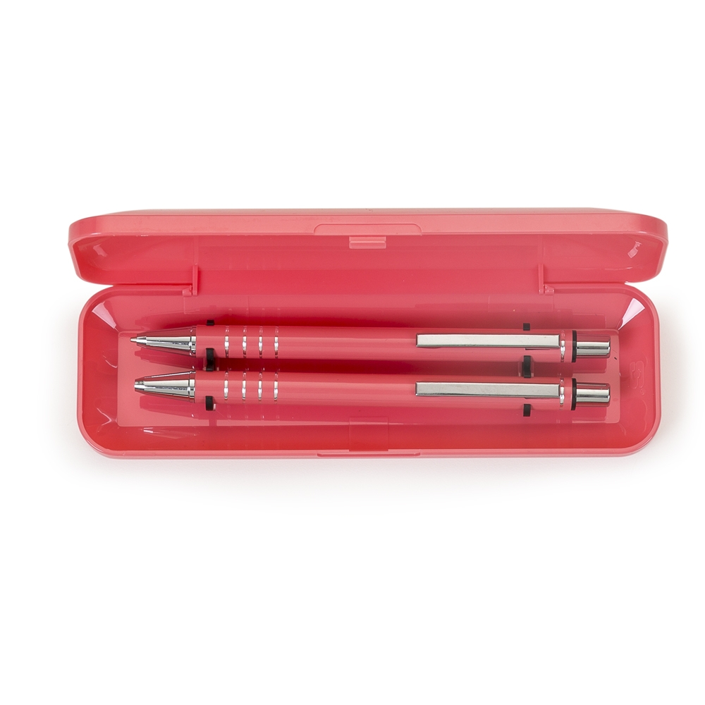 Conjunto caneta e lapiseira semi-metal e estojo plástico resistente. Estojo não é plano(apenas a parte central), caneta e lapiseira semi-metálicas inteiras coloridas com detalhes prata(acionadas por clique), clip de metal com anel e parte inferior com 4 anéis. (12608)