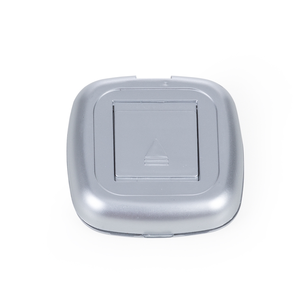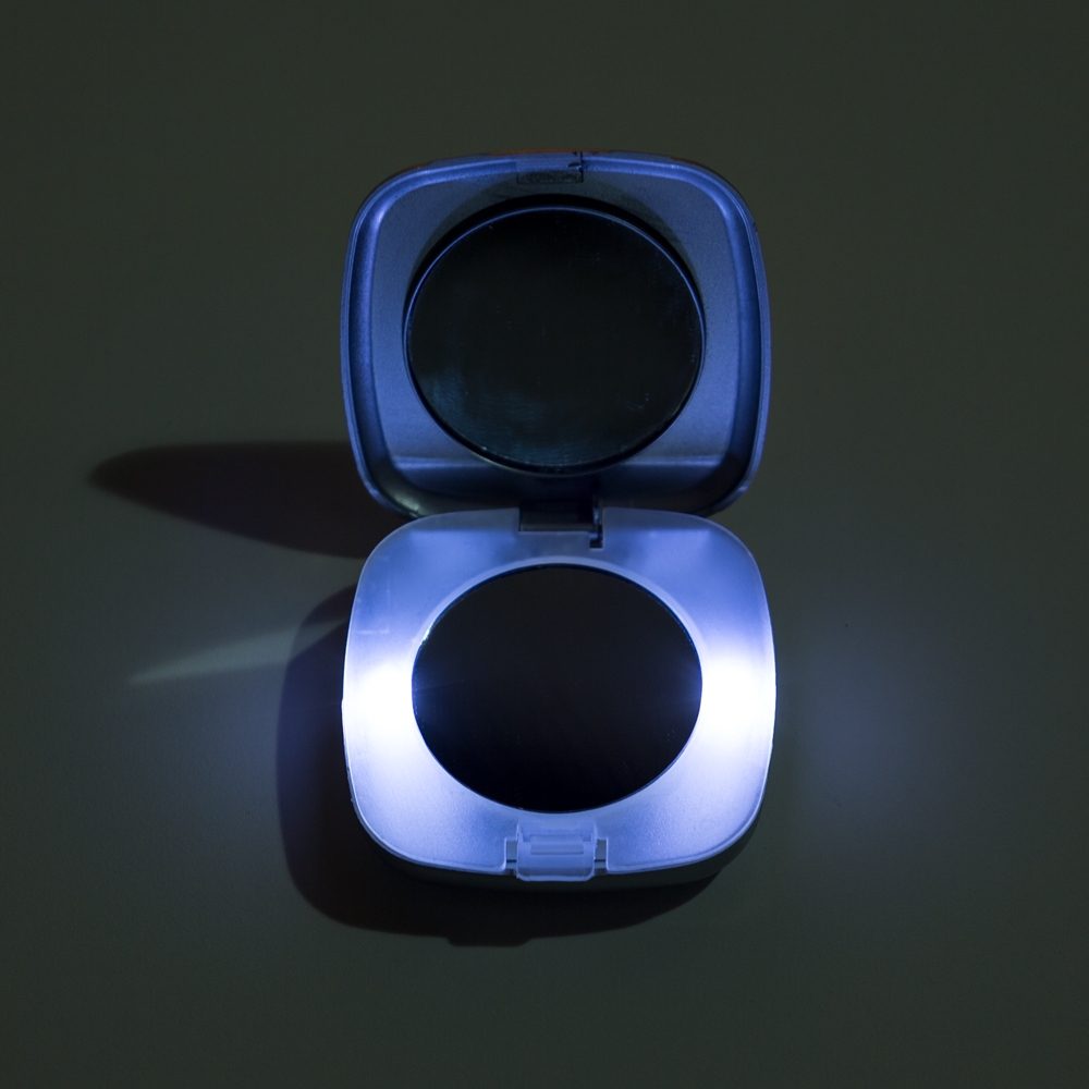 Espelho plástico com aumento e luz. Espelho quadrado de superfície lisa e laterais ovais, verso com tampa - para abri-la basta empurrar para o lado aonde indica a seta(acompanha 4 baterias LR41). Parte interna inferior com design fosco, possui 2 leds(um em cada lateral).