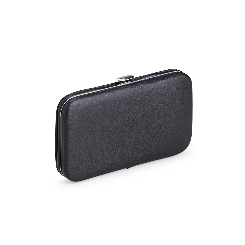 Descrição: Kit manicure 7 peças em estojo de couro sintético. Possui: dois cortadores de unhas, tesoura, lixa, pinça, empurrador de cutícula e espátula para ouvido. Parte interna de TNT com suporte de couro sintético para fixar as peças. Para abrir o estojo basta apertar o botão central.