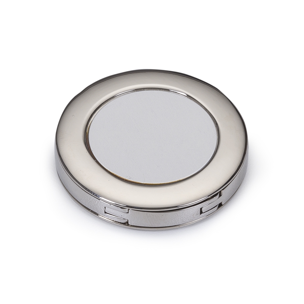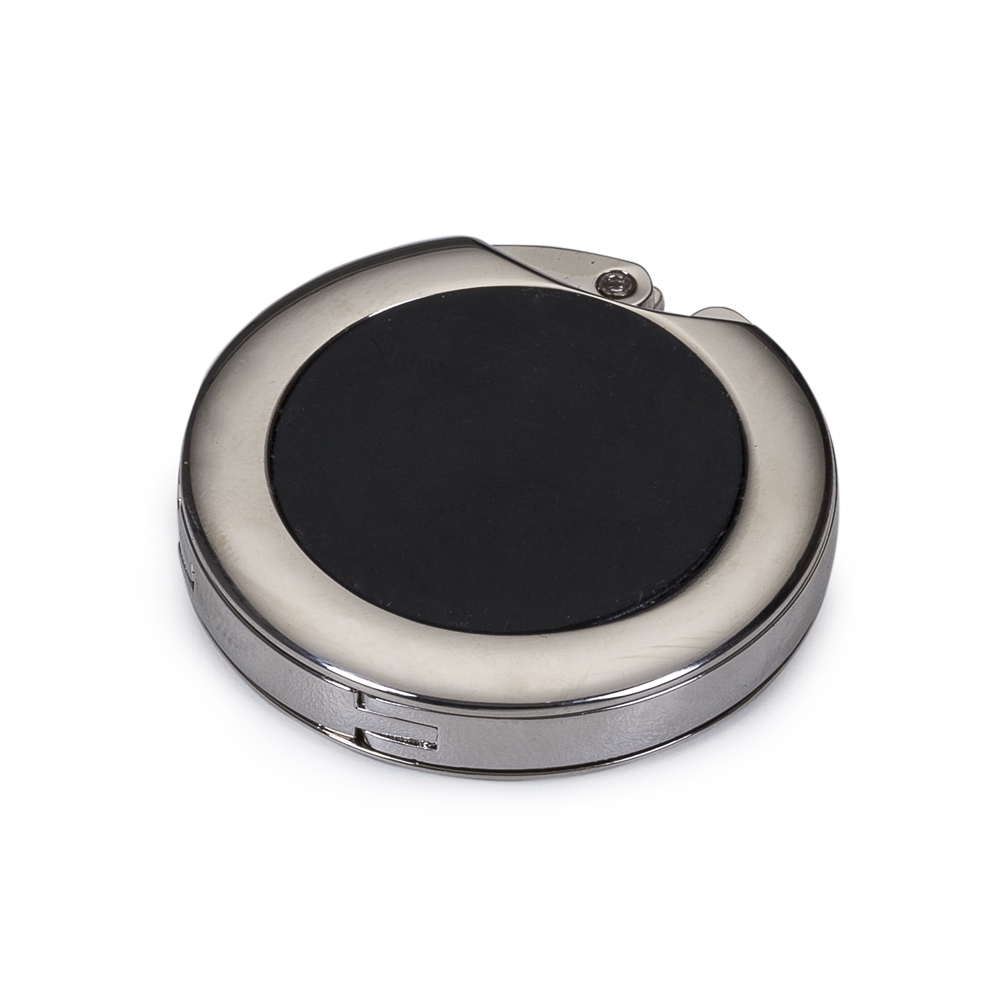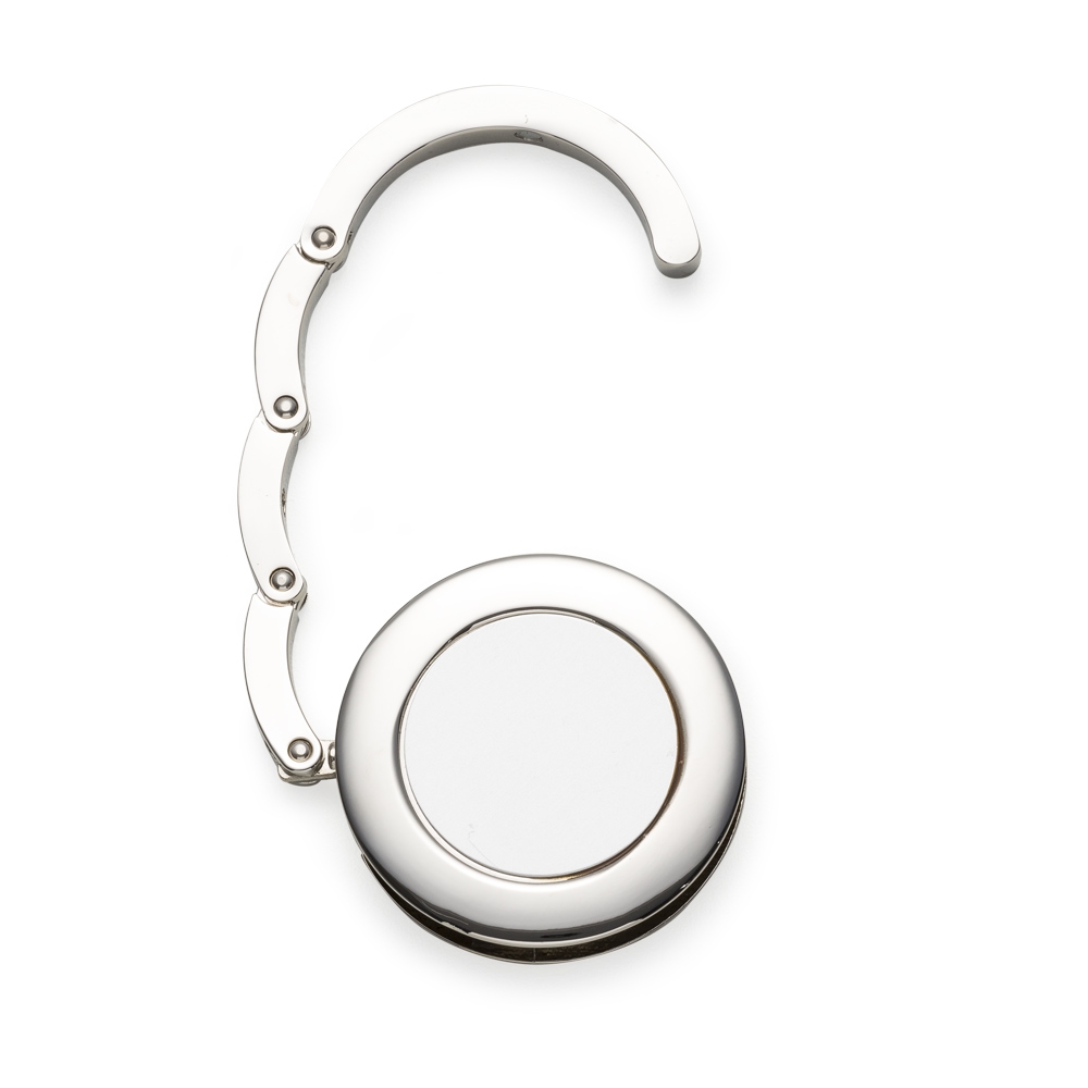 Porta bolsa de metal dobrável, possui chapa central redonda para gravação e parte traseira borracha anti deslizante. Para utilizar o porta bolsa basta puxar a lateral(é imantado) e abri-lo.