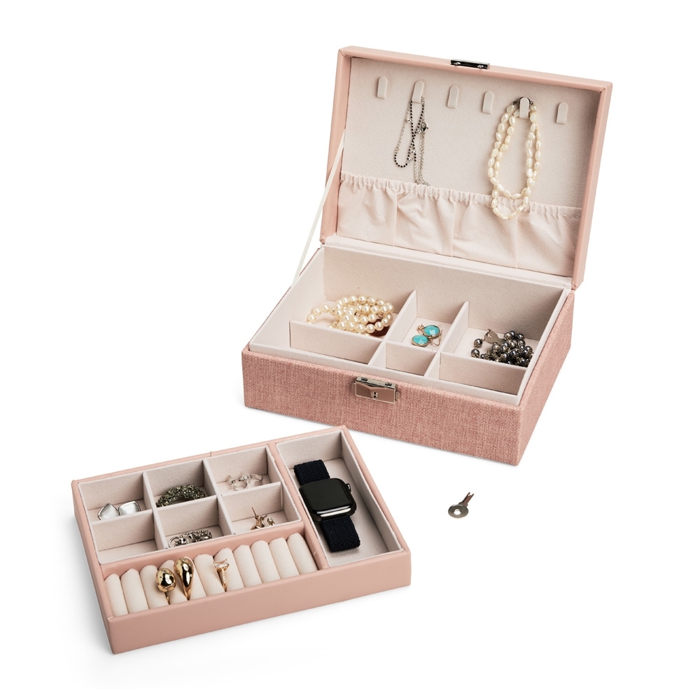 Descrição: Porta-joias em Poliuretano e revestimento interno em tecido aveludado. Apresenta dois compartimentos principais com divisórias em diferentes tamanhos, incluindo uma repartição almofadada com ranhuras. Conta ainda com seis ganchos e um bolso com elástico na parte interna da tampa. O estojo possui trava de segurança e chave para fechamento.