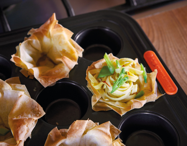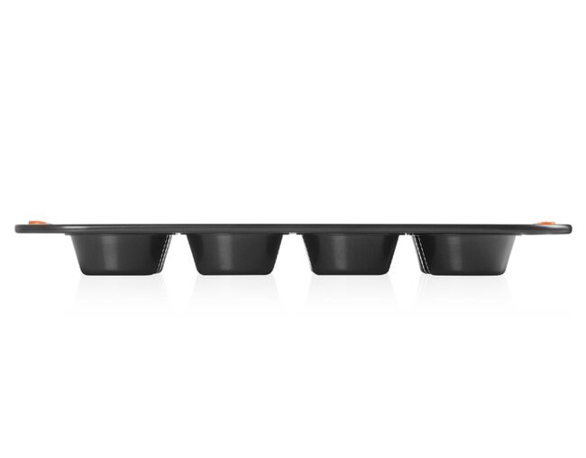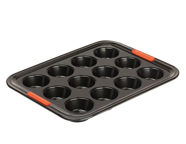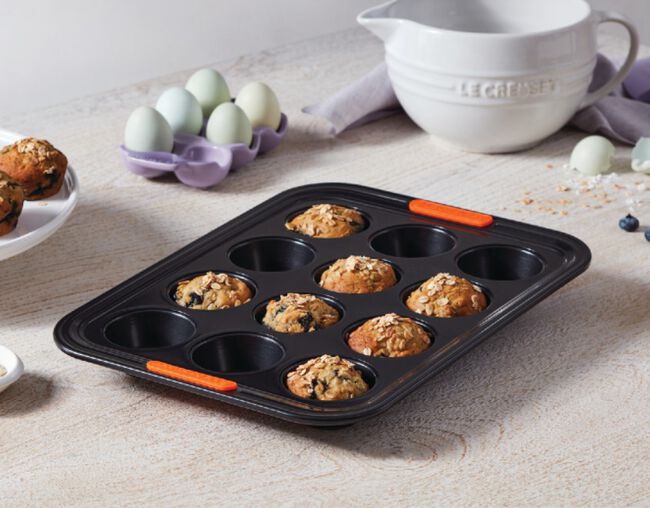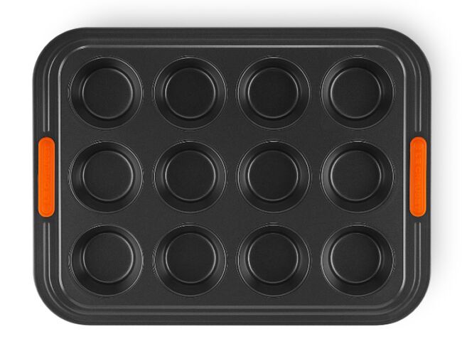 A forma para 12 muffins além de ser perfeita para fazer muffins, também é perfeita para fazer cupcakes, brioches e uma série de doces e salgados. Possui um inovador revestimento garante fácil limpeza. Seu material compõe aço carbono de grande calibre e fornece condução de calor superior. Leve e durável, obtém abas largas com alças de silicone resistentes ao calor que facilitam a transferência do forno quente para a superfície.