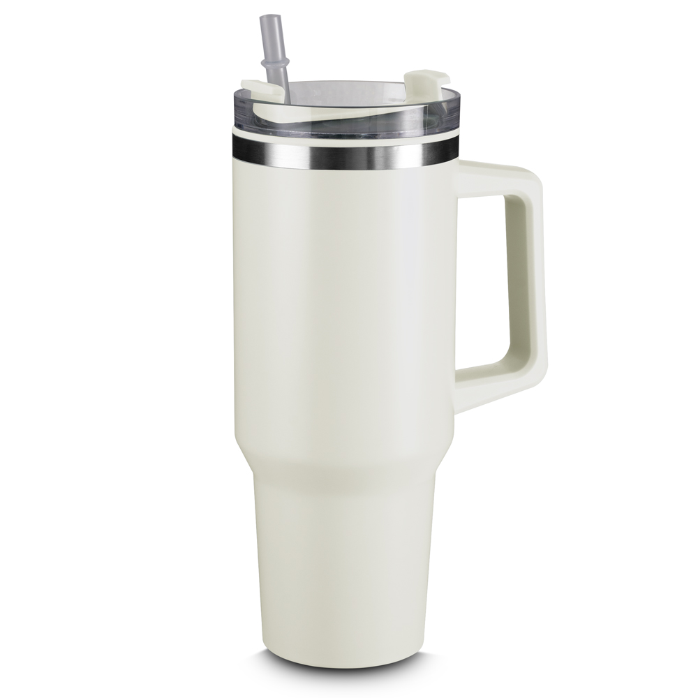 Caneca com interior em Plástico PP e externo em aço inox, alça plástica para transporte, tampa plástica com acesso para bico e canudo, com capacidade de 1.1L