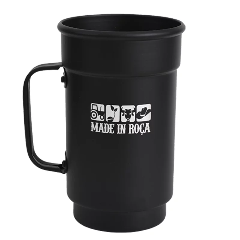 Caneca de chopp em alumínio super-resistente com acabamento reforçado, na cor preto fosco. Ela tem capacidade para 650ml.