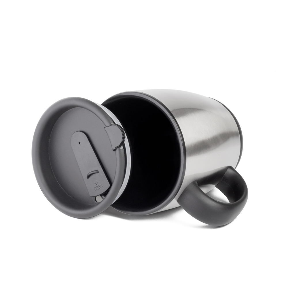 Descrição: Caneca em inox de 470ml. Possui tampa com vedação, bocal com trava de segurança e pegador de plástico.