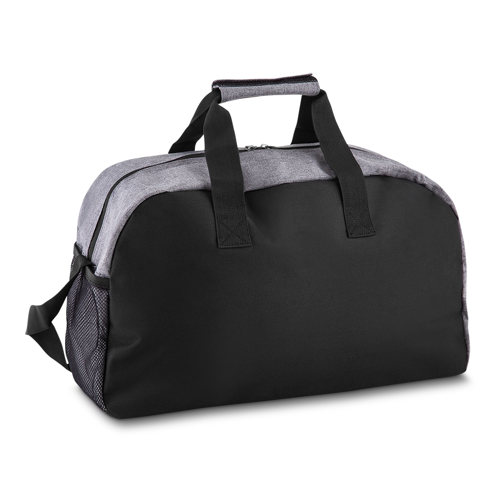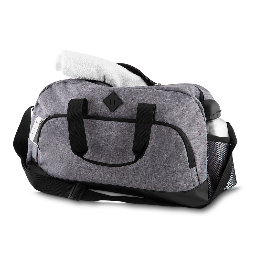 Mala esportiva de poliéster. Possui bolso frontal, bolso lateral de malha e bolso grande superior. Alça de mão com pegador cinza de velcro e alça transversal ajustável. (14186)